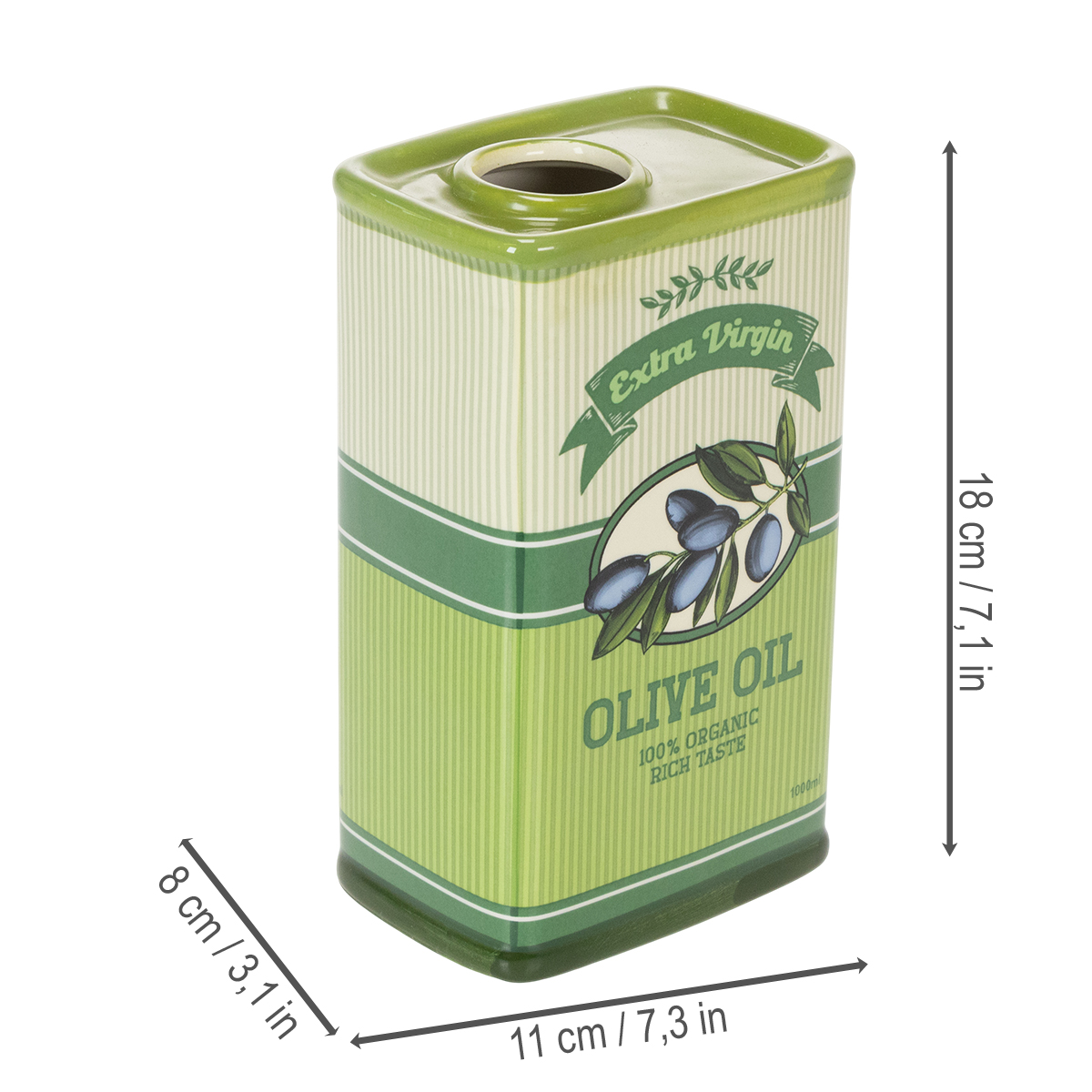 Nuestro aceitero de cerámica impresiona con detalles que se aprecian a primera vista: su nostálgico diseño retro, inspirado en las cocinas mediterráneas, refleja tradición y estilo. Su elegante tono verde aporta una frescura natural a cualquier ambiente, ya sea una mesa moderna o una cocina rústica. Su generosa capacidad y amplia abertura facilitan enormemente el vertido del aceite. Y cuando no se utiliza, este encantador jarrón se convierte en un llamativo elemento decorativo.