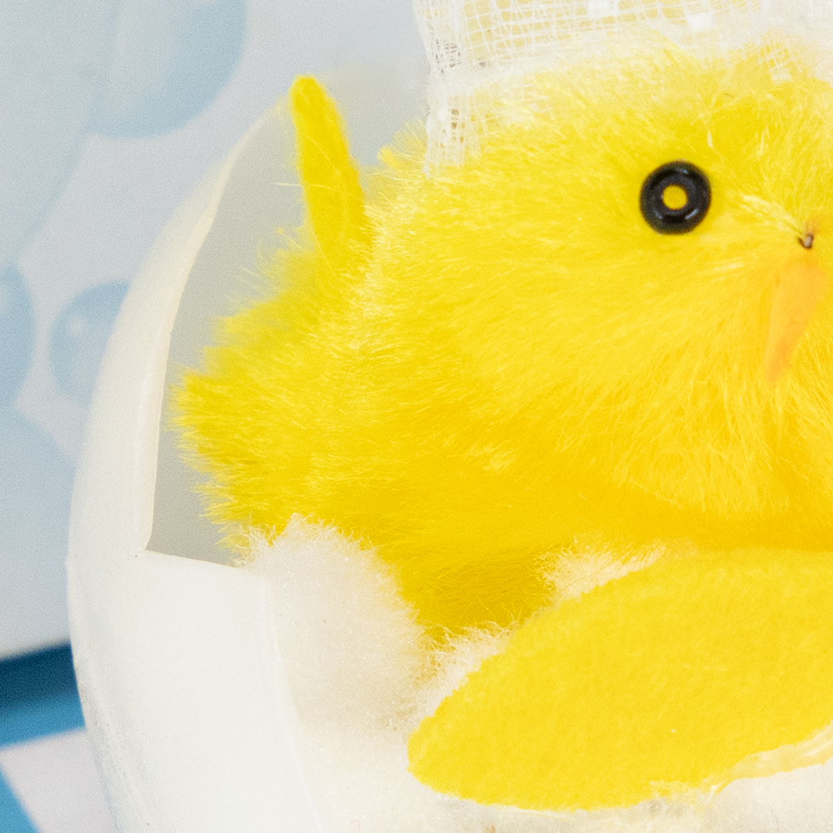 El pollito chenille amarillo en el baño mide aproximadamente 8,5 centímetros de largo con la pantalla de cartón y tiene una ducha además del baño, en el que flota espuma de bolas de algodón blanco, de donde proviene el agua, aquí representada por tela de organza. El pez, las alas amarillas y el pico naranja están hechos de fieltro y completan la encantadora imagen del pollito de Pascua que se baña con los ojos negros.