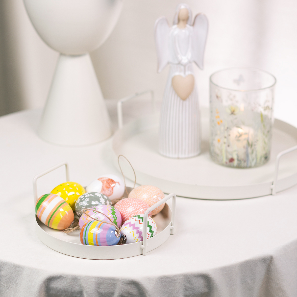 Estos encantadores adornos de huevos de Pascua son prácticos y elegantes. Cada una de las doce miniaturas está decorada con cariño con delicados patrones e impresiona por el carácter atemporal de sus colores y diseños. Su práctico tamaño de 6 cm es ideal para una amplia variedad de ideas de decoración. Gracias al robusto material plástico, los adornos son duraderos y resistentes, aptos tanto para interiores como para exteriores protegidos.