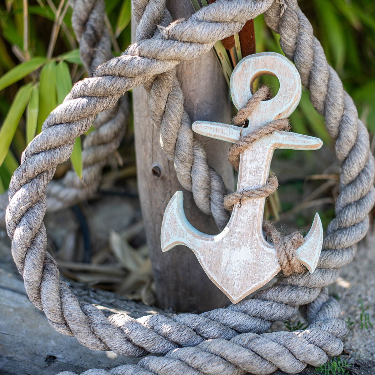 ¿Escaparates marítimos, pasión por los viajes convertida en madera para la agencia de viajes o decoraciones de mesas náuticas con anclas de madera y conchas? El ancla del barco como soporte o como decoración de pared ofrece muchas posibilidades. Por ejemplo, puedes combinar un caballito de mar, un faro o un pez de madera con el ancla para la decoración de habitaciones o la decoración de restaurantes de estilo marinero. Una linterna LED rústica combinada con un ancla decorativa de madera crea un ambiente veraniego acogedor y marinero.