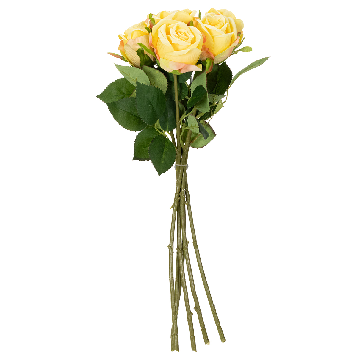 Este arreglo floral de seis magníficas rosas amarillas impresiona por su meticulosa elaboración y versatilidad. Las flores de poliéster de alta calidad lucen increíblemente realistas, mientras que las hojas y los tallos realzan aún más su aspecto. Con 44 cm de largo, el ramo es ideal para jarrones medianos, creando una composición armoniosa sin esfuerzo. El radiante color amarillo de las rosas irradia calidez y alegría de vivir, lo que lo convierte en la opción perfecta para habitaciones de estilo moderno, clásico o incluso mediterráneo.