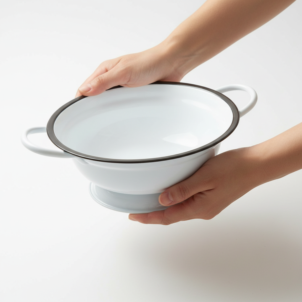 - Material: Metal con aspecto de esmalte blanco con borde negro.