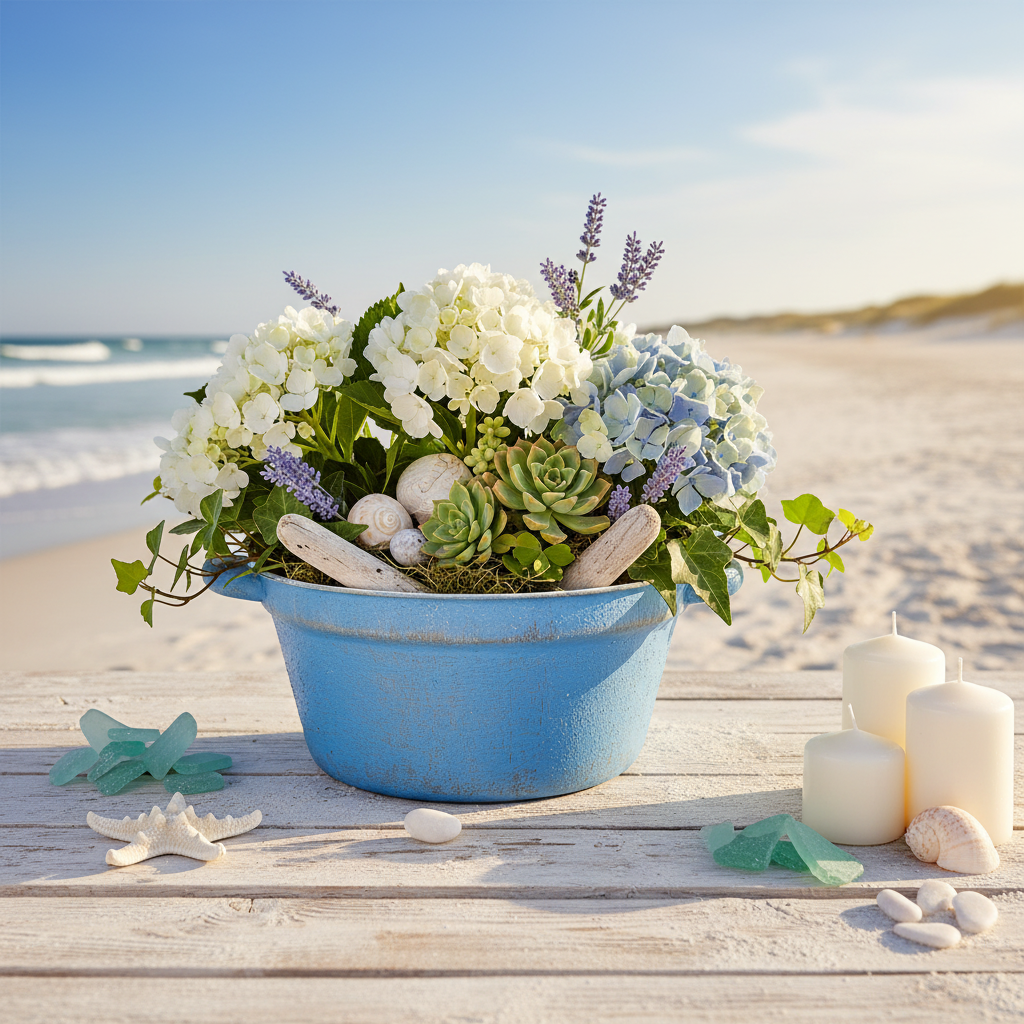 La decoración de metal también se ve hermosa con piedras decorativas o arena y suculentas. Debido a la combinación de colores, la jardinera también encaja perfectamente en cualquier decoración marítima. Decora el cuenco con arena, flores secas, conchas y madera flotante. Así es como el macetero de metal se convierte en una armoniosa decoración de mesa.