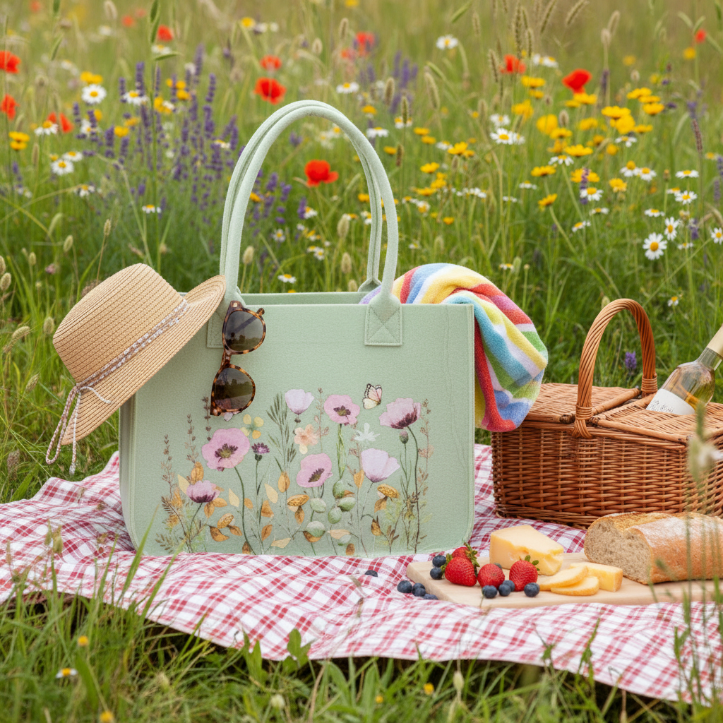 Hecho de fieltro resistente en un elegante color verde, este bolso aporta un toque natural y rebosa encanto veraniego. El estampado floral, cuidadosamente diseñado en la parte delantera, le da un aspecto único que evoca prados florecientes de verano. Este bolso es perfecto para casi cualquier idea de decoración primaveral. ¿Y lo mejor?