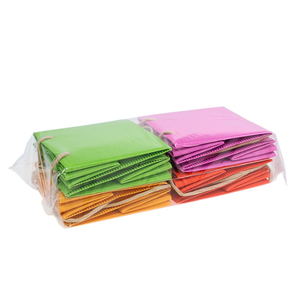 La bolsa de papel forma parte de un conjunto de 8, con 2 bolsas cada una de color naranja, verde, amarillo o rosa. Las dimensiones de cada bolsa son aproximadamente 10.5 x 10.5 x 10.5 centímetros. La bolsa de regalo también es muy resistente porque su superficie está ranurada y, por lo tanto, soporta más peso. Además, el piso está reforzado con cartón extra. La bolsa de asas también es bastante inteligente, si rellena galletas caseras u otras golosinas y luego las lleva con estilo a una reunión con amigos.