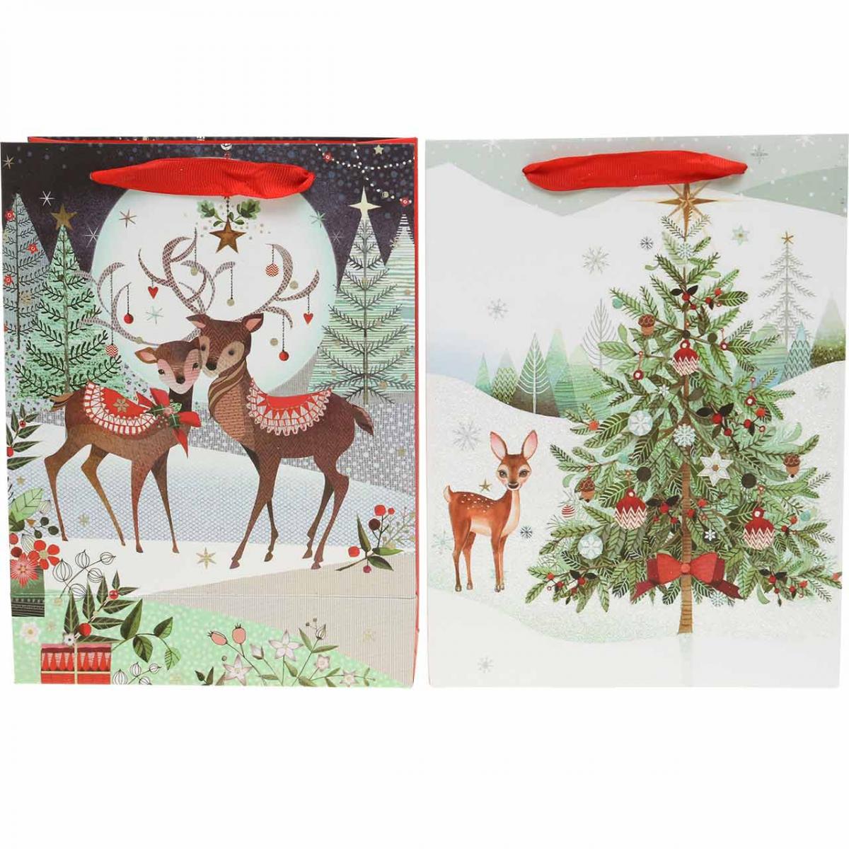 Las bolsas de regalo están hechas de cartón estable de alta calidad, están extra reforzadas en la parte inferior y tienen dos cordones rojos brillantes para transportar. Además, ambos tienen diferentes motivos, cada uno con purpurina en un lado: en un bolso puedes ver un paisaje invernal en el que un lindo cervatillo está de pie junto a un árbol de Navidad decorado festivamente. En la otra bolsa puedes ver un par de renos, cuyas astas están adornadas con adornos para árboles de Navidad. Los renos se paran muy juntos en un bosque nevado y la luna llena brilla románticamente en el fondo.