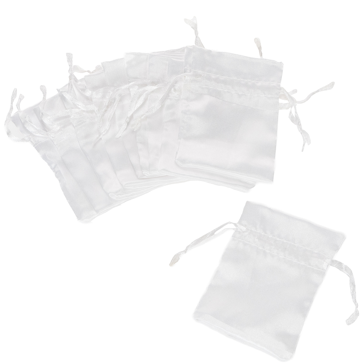 Las bolsas de satén blanco vienen a ti como un conjunto de 10 piezas. Cada bolsa de joyería mide aproximadamente 6.5 centímetros de ancho y aproximadamente 10 centímetros de alto y tiene un cordón para cerrar fácilmente.