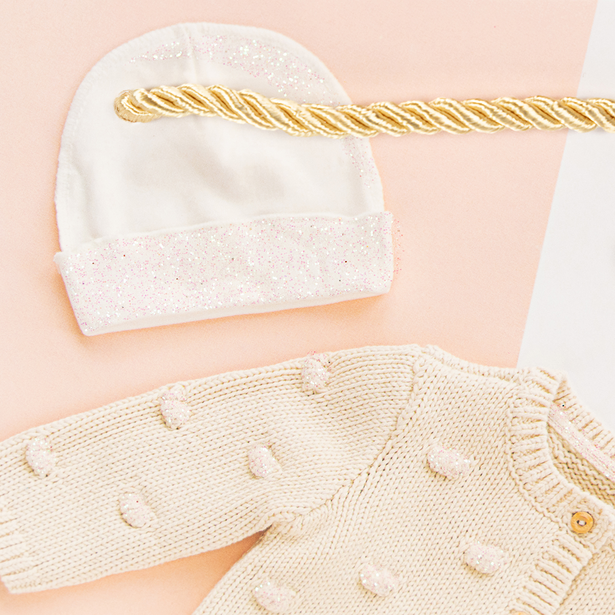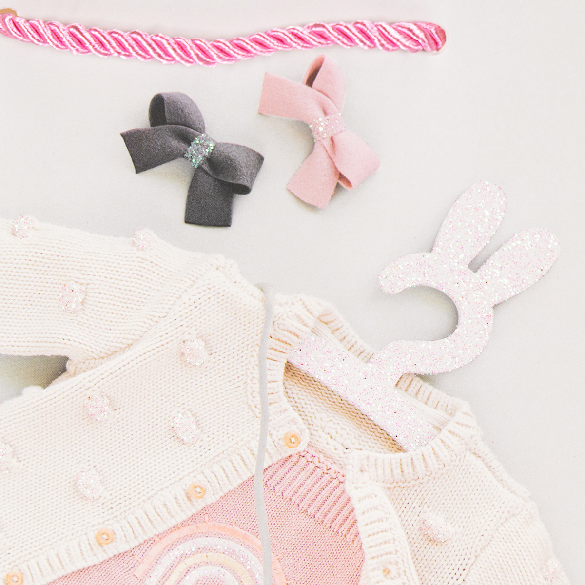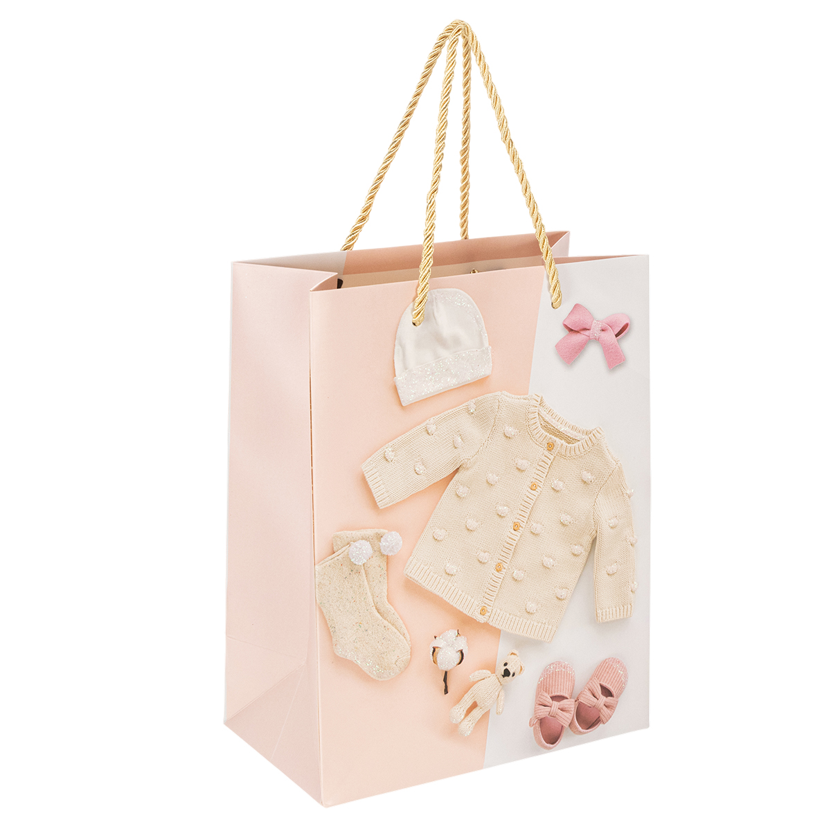 Las bolsas de regalo tienen un diseño variado con cárdigans, patucos, biberones y muchos otros simpáticos complementos para bebés. Los efectos de purpurina en las bolsas de papel resaltan los detalles y aportan un extra de magia al envoltorio de regalo.