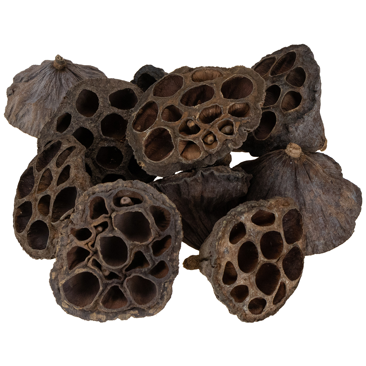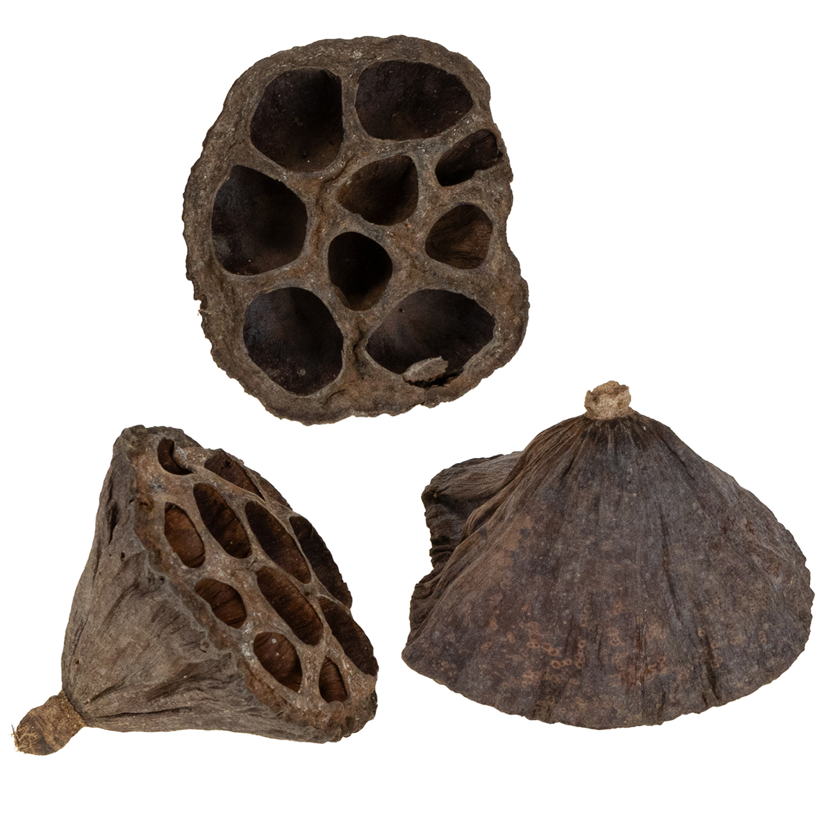 Los matraces de loto con forma cónica se secaron, pero aún contienen parcialmente las semillas y están en una bolsa de plástico con un total de 100 piezas. Como se trata de productos naturales, los tamaños pueden variar. Las cápsulas tienen aproximadamente entre 3.5 y 7 centímetros de largo y cada una tiene un diámetro de 3 a 6 centímetros.