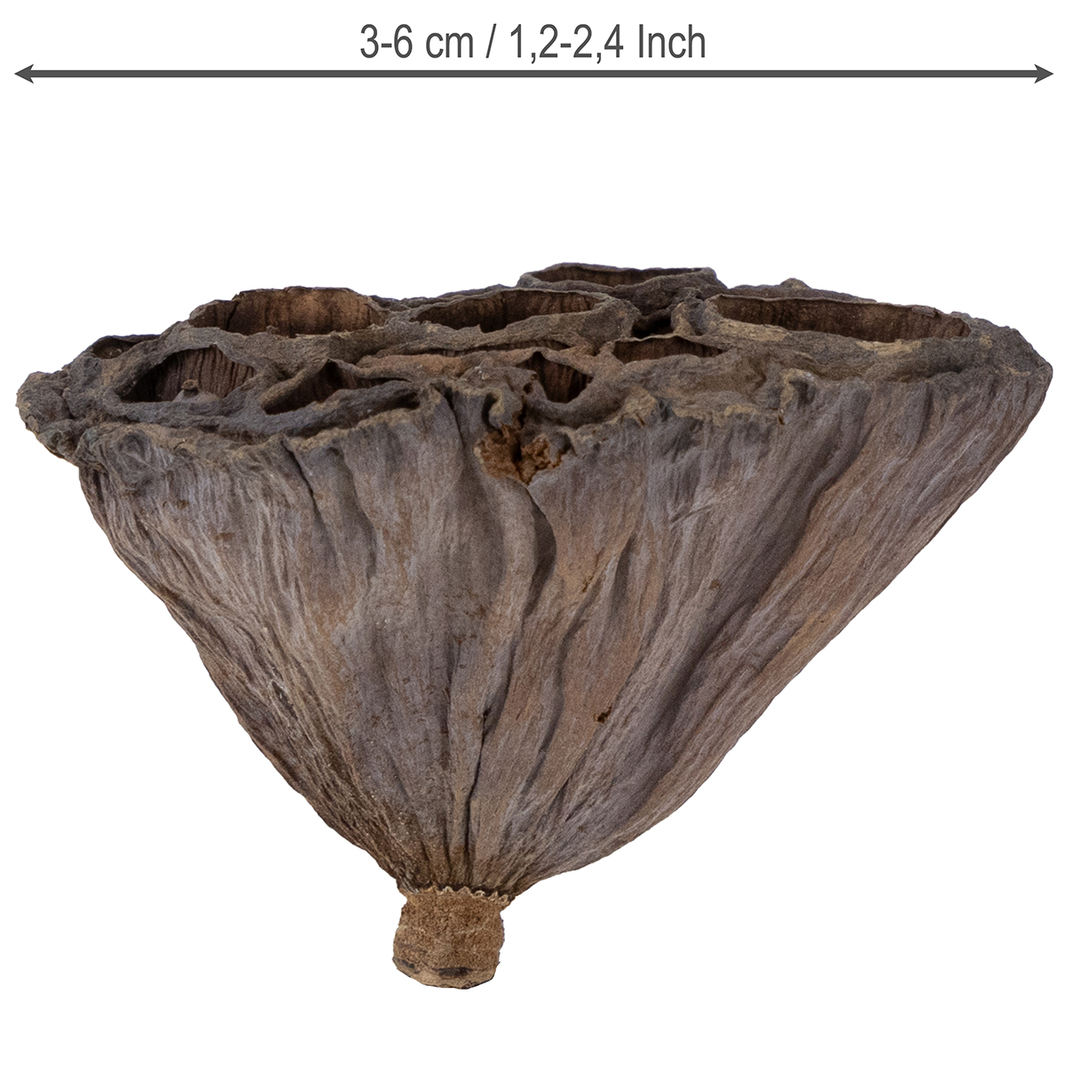 Los matraces de loto con forma cónica se secaron, pero aún contienen parcialmente las semillas y están en una bolsa de plástico con un total de 100 piezas. Como se trata de productos naturales, los tamaños pueden variar. Las cápsulas tienen aproximadamente entre 3.5 y 7 centímetros de largo y cada una tiene un diámetro de 3 a 6 centímetros.