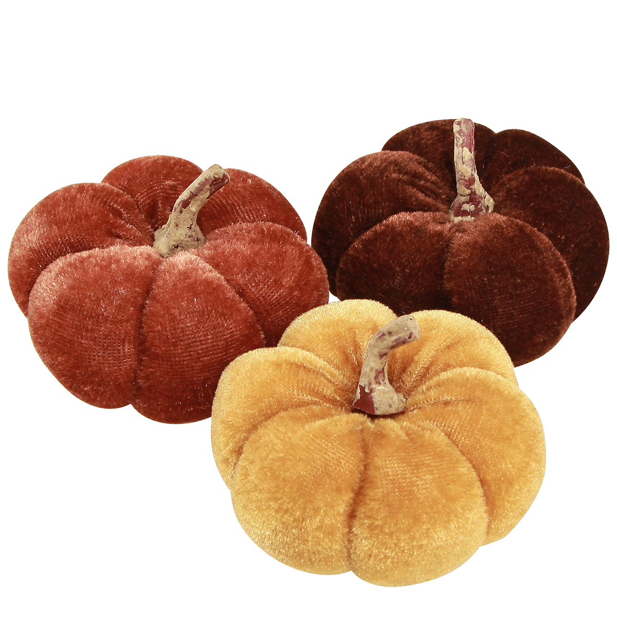 - Calabazas de tela aterciopelada en amarillo, marrón y marrón oscuro
