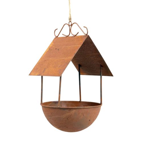 La pajarera decorativa está diseñada como bebedero para pájaros y decorada con una elegante pátina como decoración de jardín. Se utiliza un cordón para colgar.Cuatro varillas sujetan el tejado a dos aguas sobre la piscina en forma de cuenco. En el techo hay dos volutas que dan un aspecto aún mejor a la decorativa bañera para pájaros patinada. Un cordón de color natural completa el look vintage.