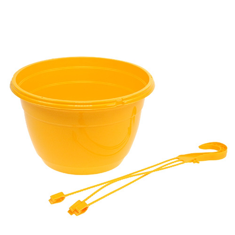 La cesta colgante amarilla, hecha de plástico ligero pero resistente, tiene un diámetro exterior de unos 25 centímetros, un diámetro interior de unos 23 centímetros y un diámetro de base de unos 15 centímetros. La maceta en sí mide unos 15,5 centímetros de alto y una longitud total de unos 50 centímetros. Tenga en cuenta que la cesta colgante se entrega sin platillo y, por lo tanto, solo es adecuada para uso en exteriores.