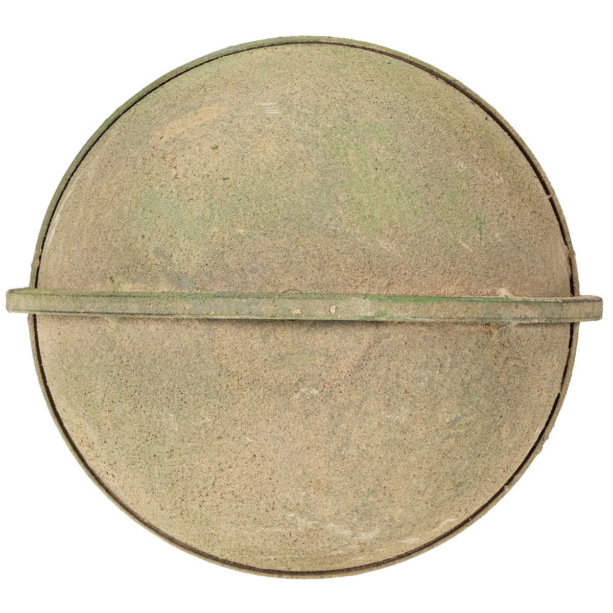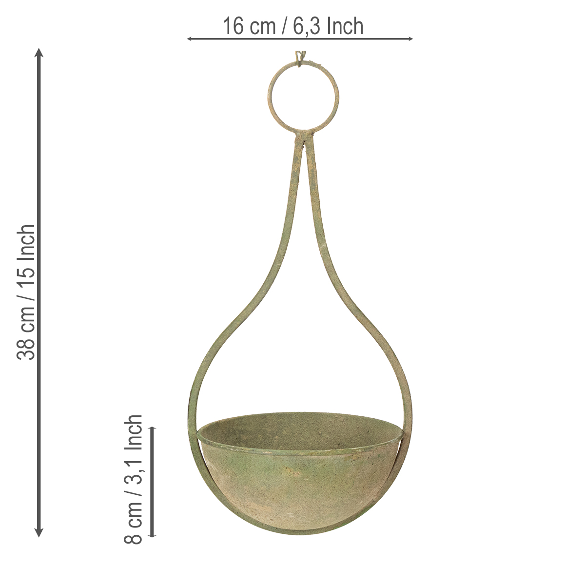 La cesta colgante de metal consiste en un cuenco redondo que está sujeto por un arco circular que converge hacia la parte superior.