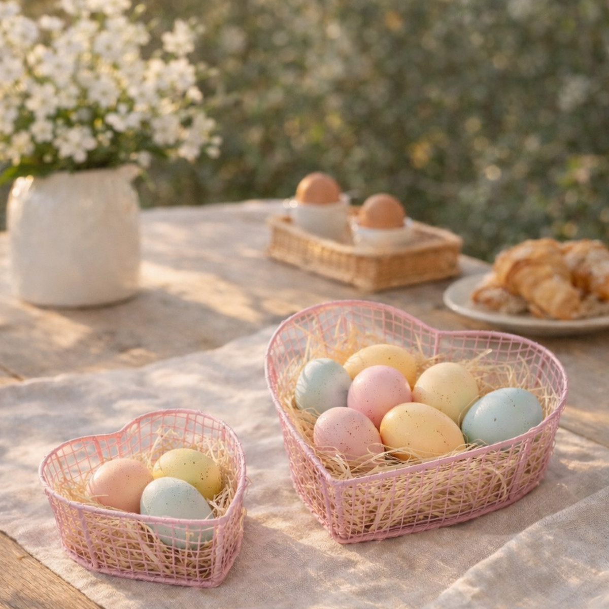 Crea un ambiente romántico y organizado con estas hermosas cestas de alambre en forma de corazón. Ya sea como detalle decorativo en la mesa, para guardar pequeños objetos o como un elegante set de regalo, estas cestas de metal en forma de corazón aportan amor y orden a tu hogar. Hechas de metal resistente, las cestas vienen en suaves tonos rosa y morado. Son perfectas para usar en salas de estar o espacios exteriores protegidos, y son la opción ideal para una decoración romántica de mesa en ocasiones especiales como bodas, San Valentín o cumpleaños.