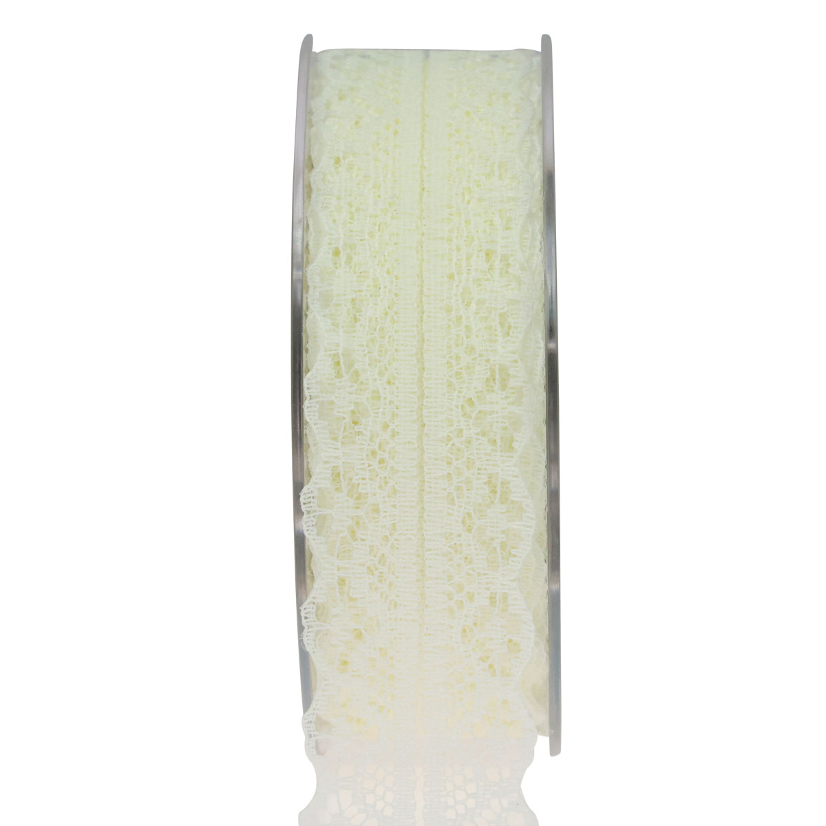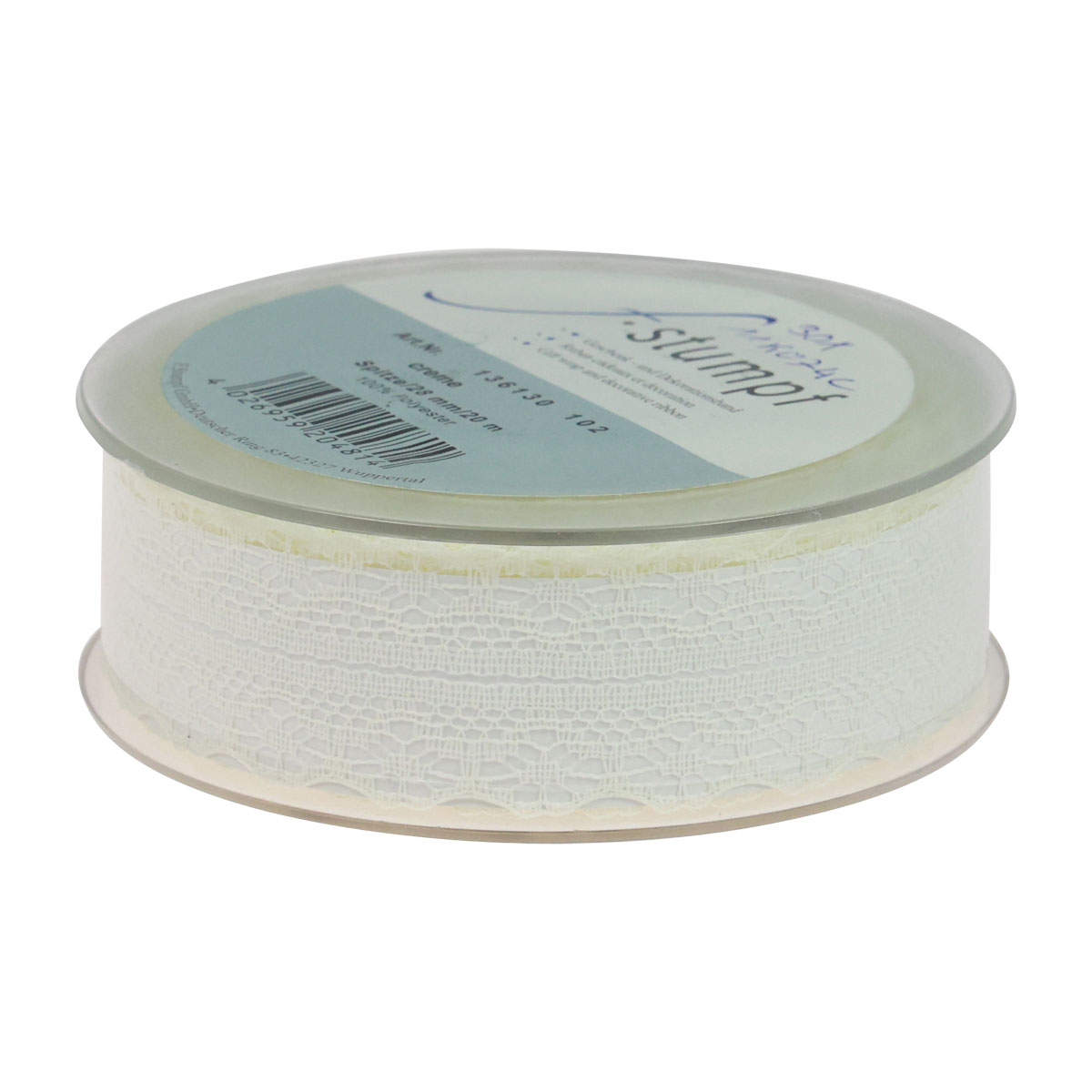 La delicada cinta de encaje mide aproximadamente 28 milímetros de ancho y 20 metros de largo. La cinta decorativa se entrega en una práctica bobina de plástico para medir y cortar fácilmente.