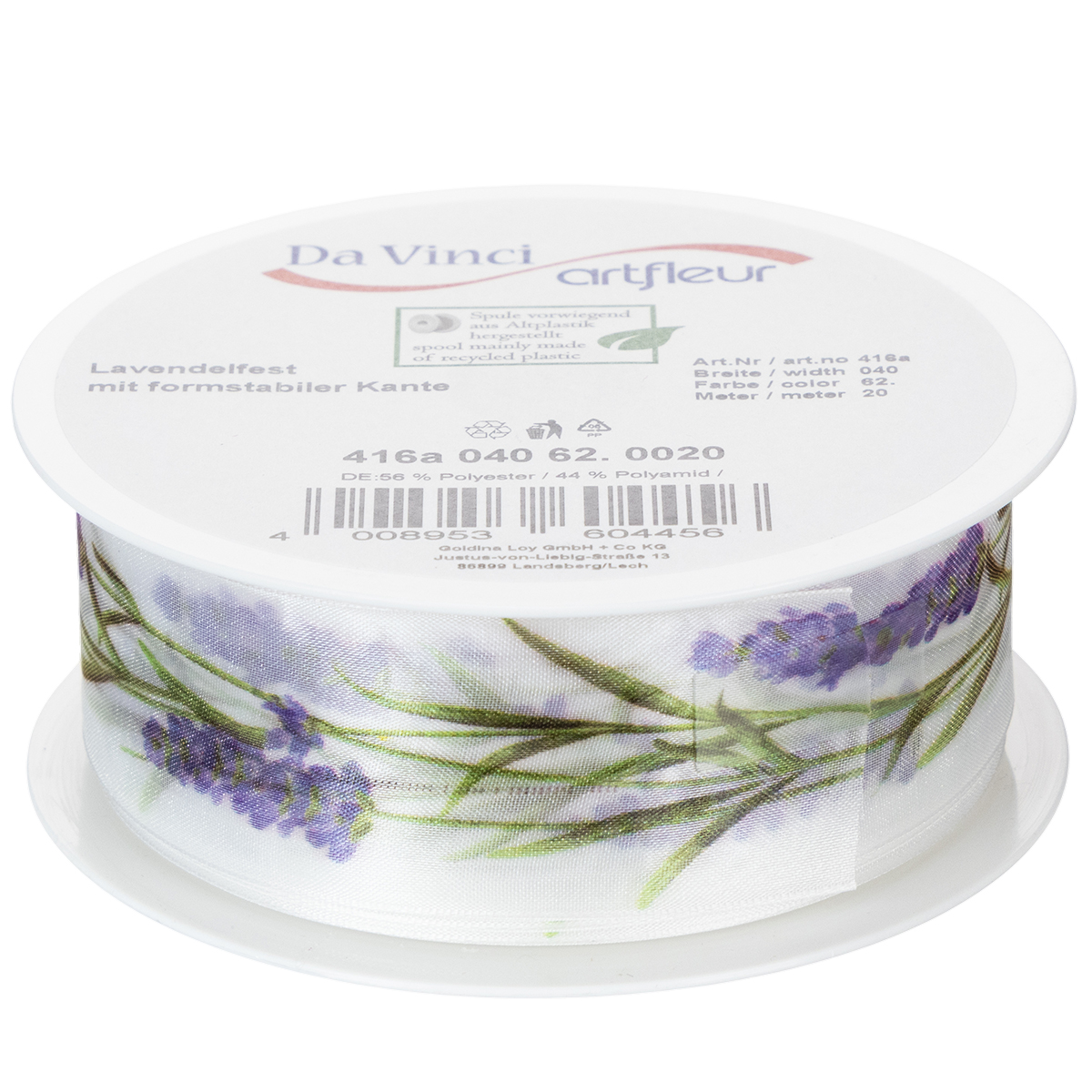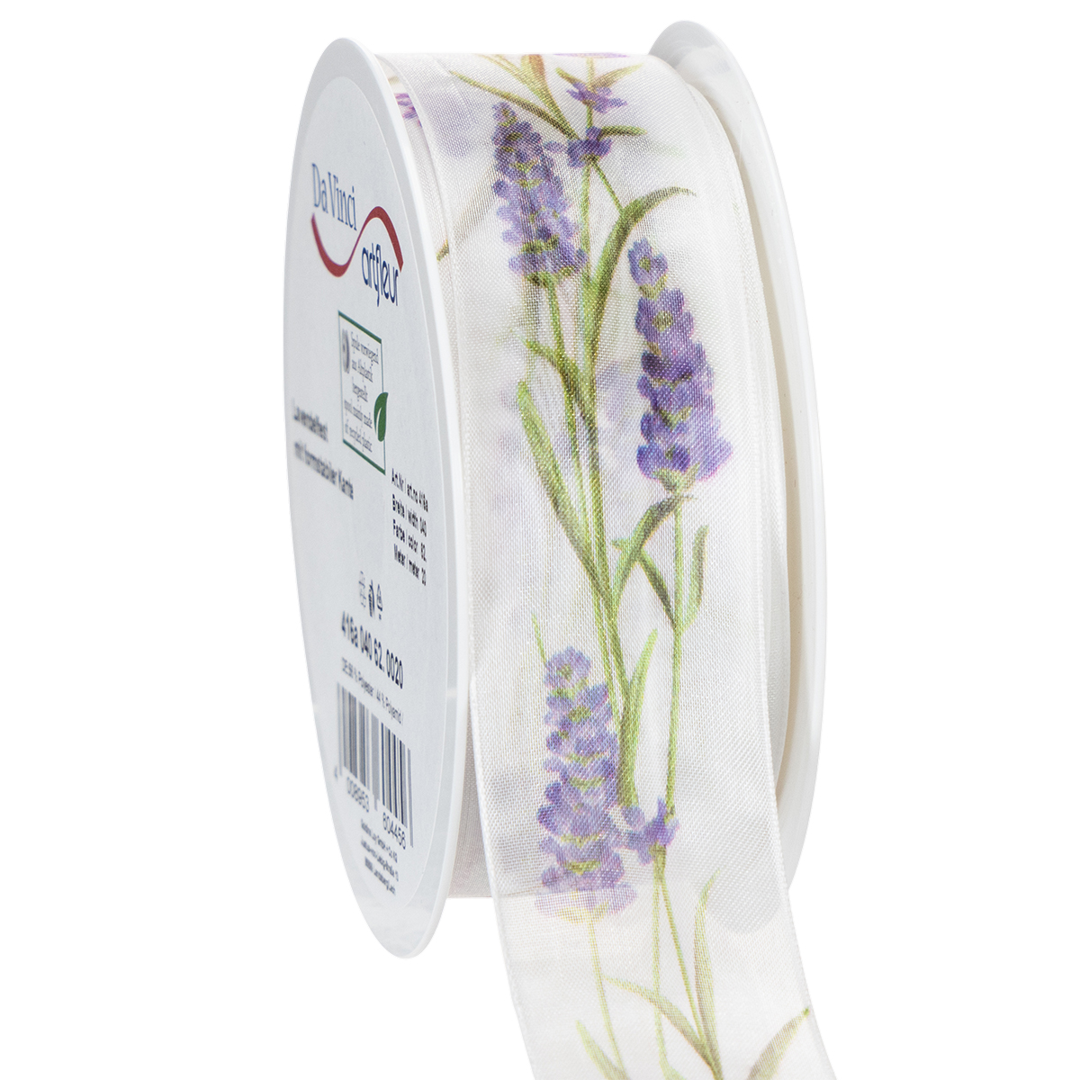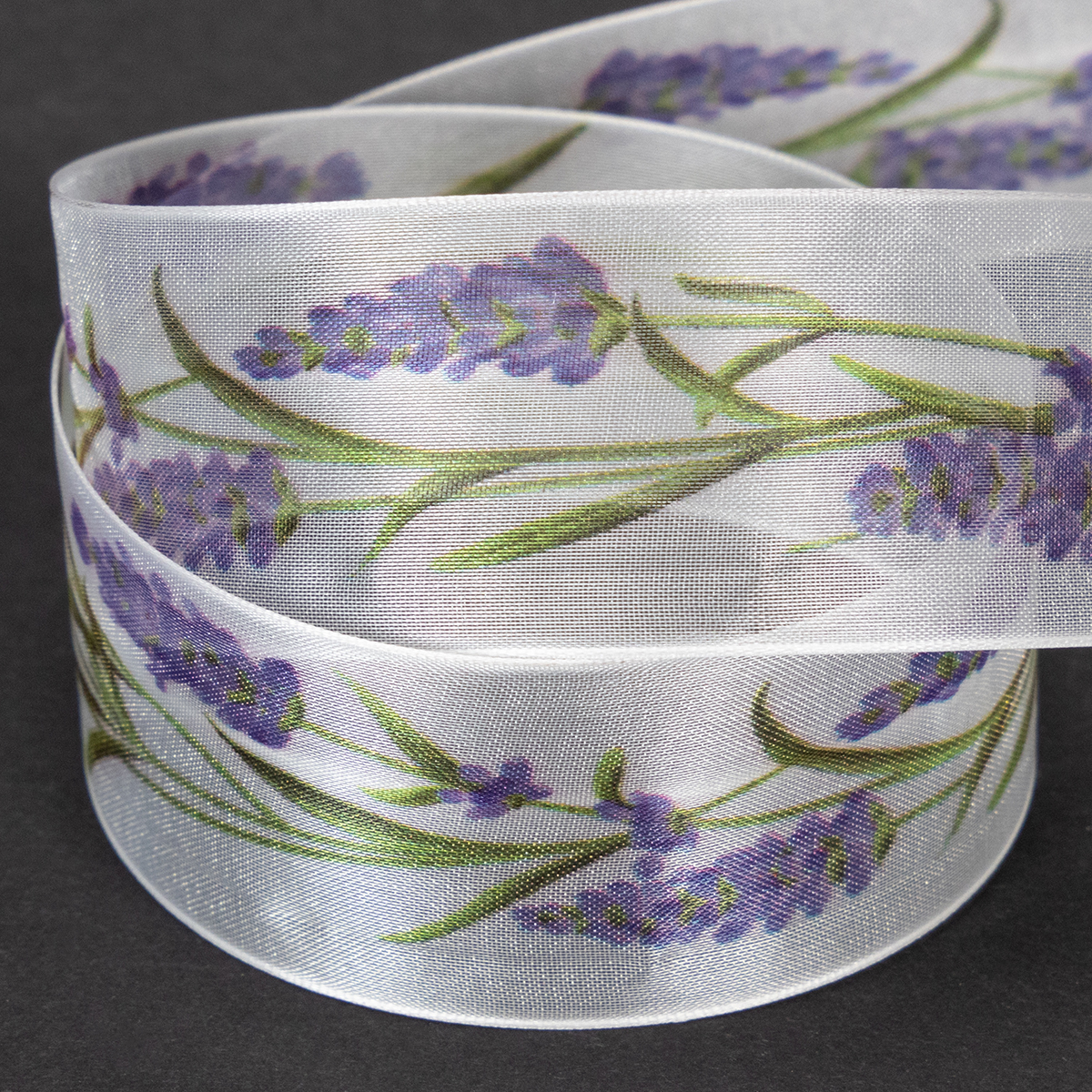 El motivo de lavanda luce fresco y colorido sobre el fondo blanco de la cinta de organza. Con su tejido de organza transparente, la cinta de gasa es ligera y tiene un brillo característico, mientras que los bordes que mantienen la forma hacen que los lazos luzcan pintorescos.