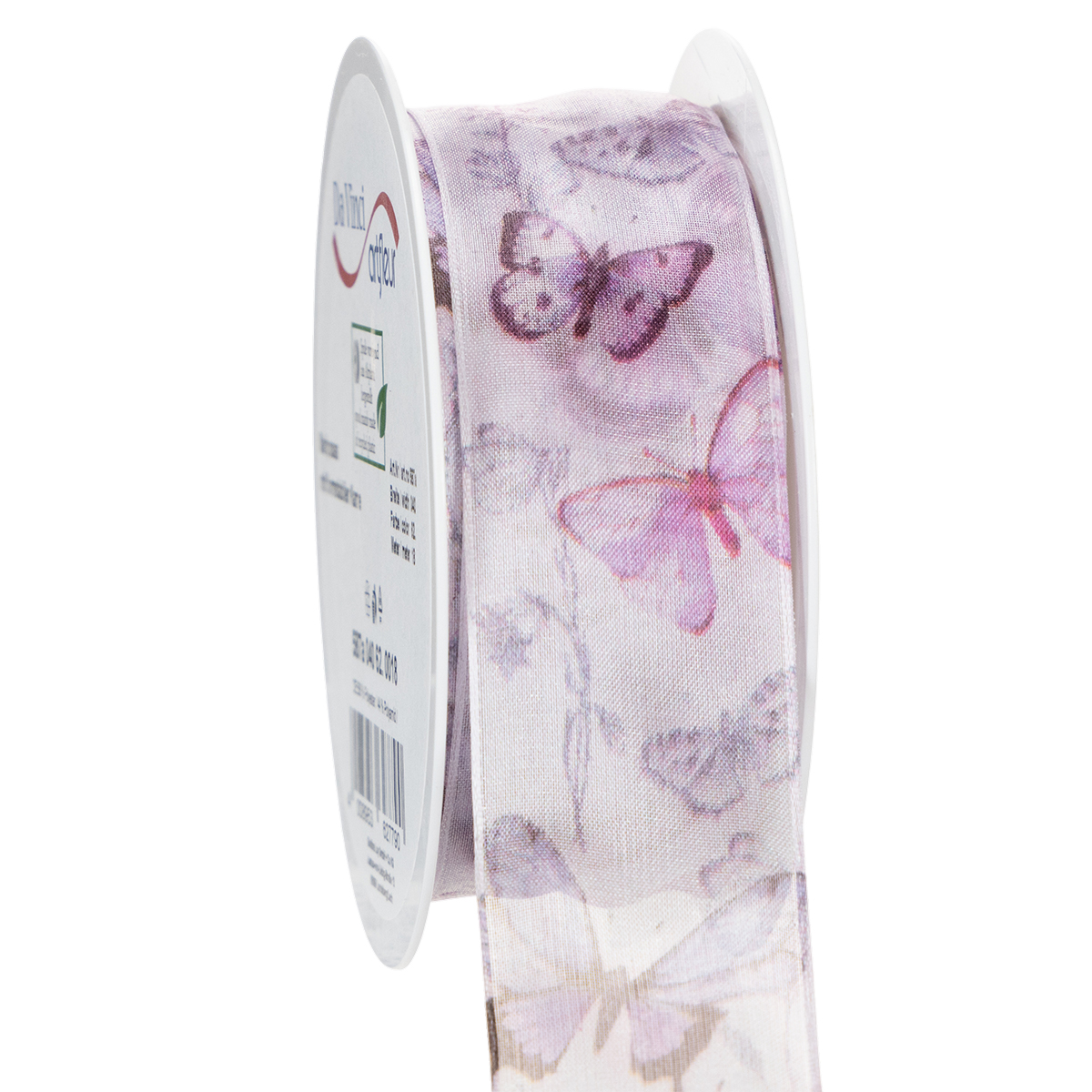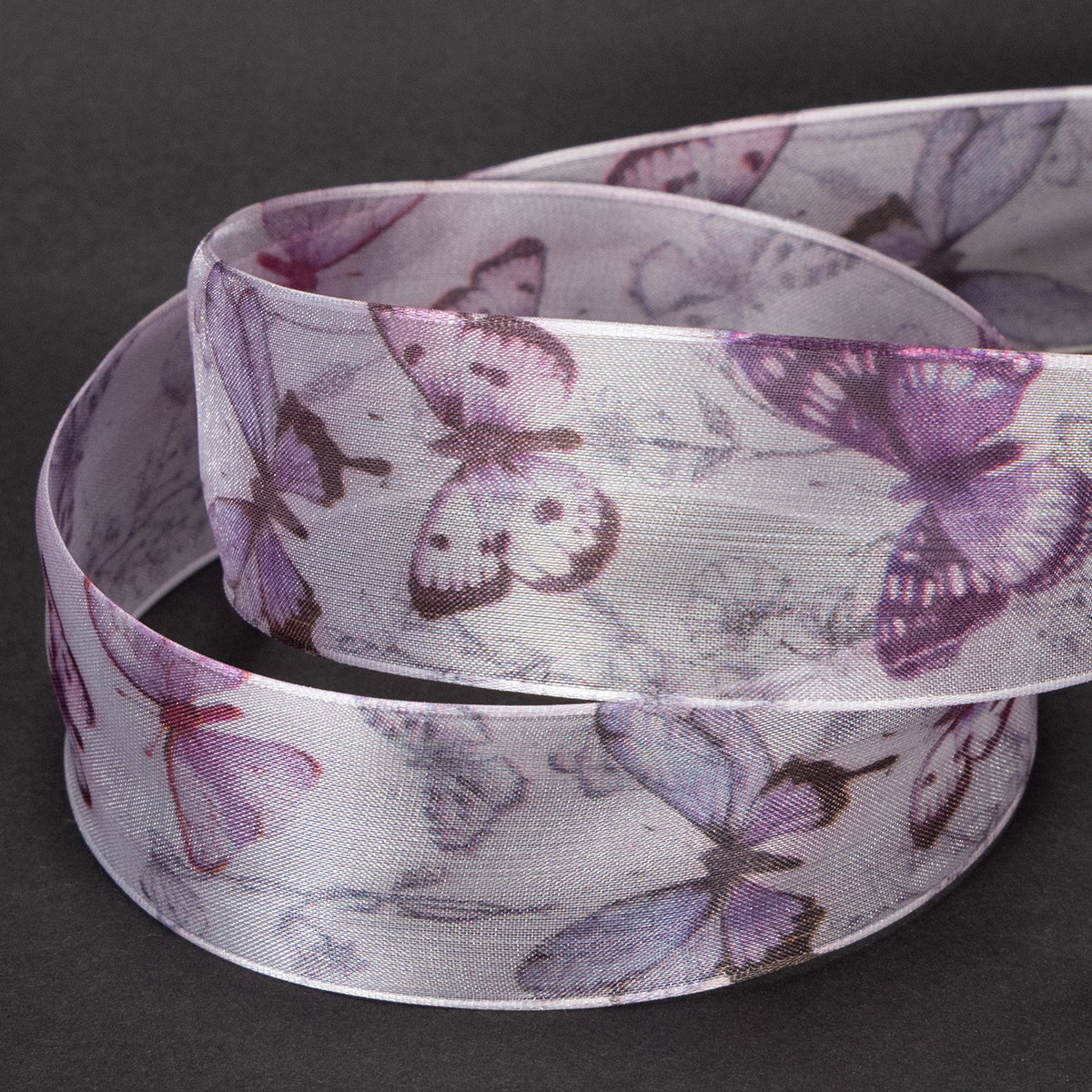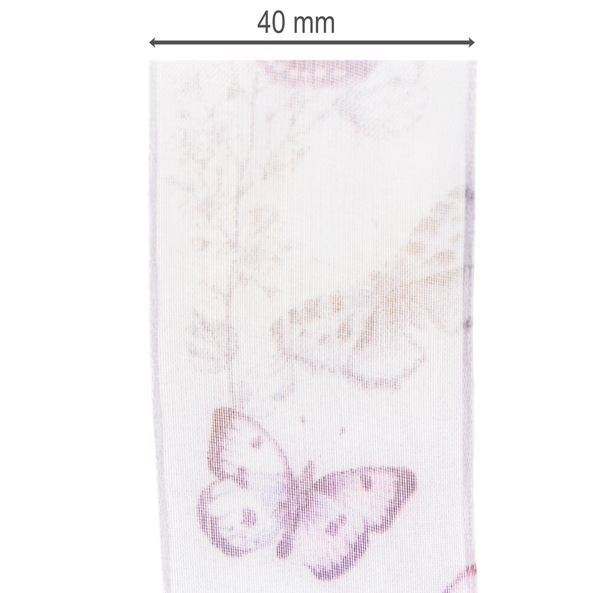 Las mariposas representadas con gran detalle pertenecen a especies diferentes, exóticas y especialmente bellas, lo que hace que el motivo parezca muy sofisticado. La ancha cinta de gasa tiene un aspecto delicado y ligero gracias al tejido de organza transparente, mientras que el borde garantiza que los lazos conserven su forma.