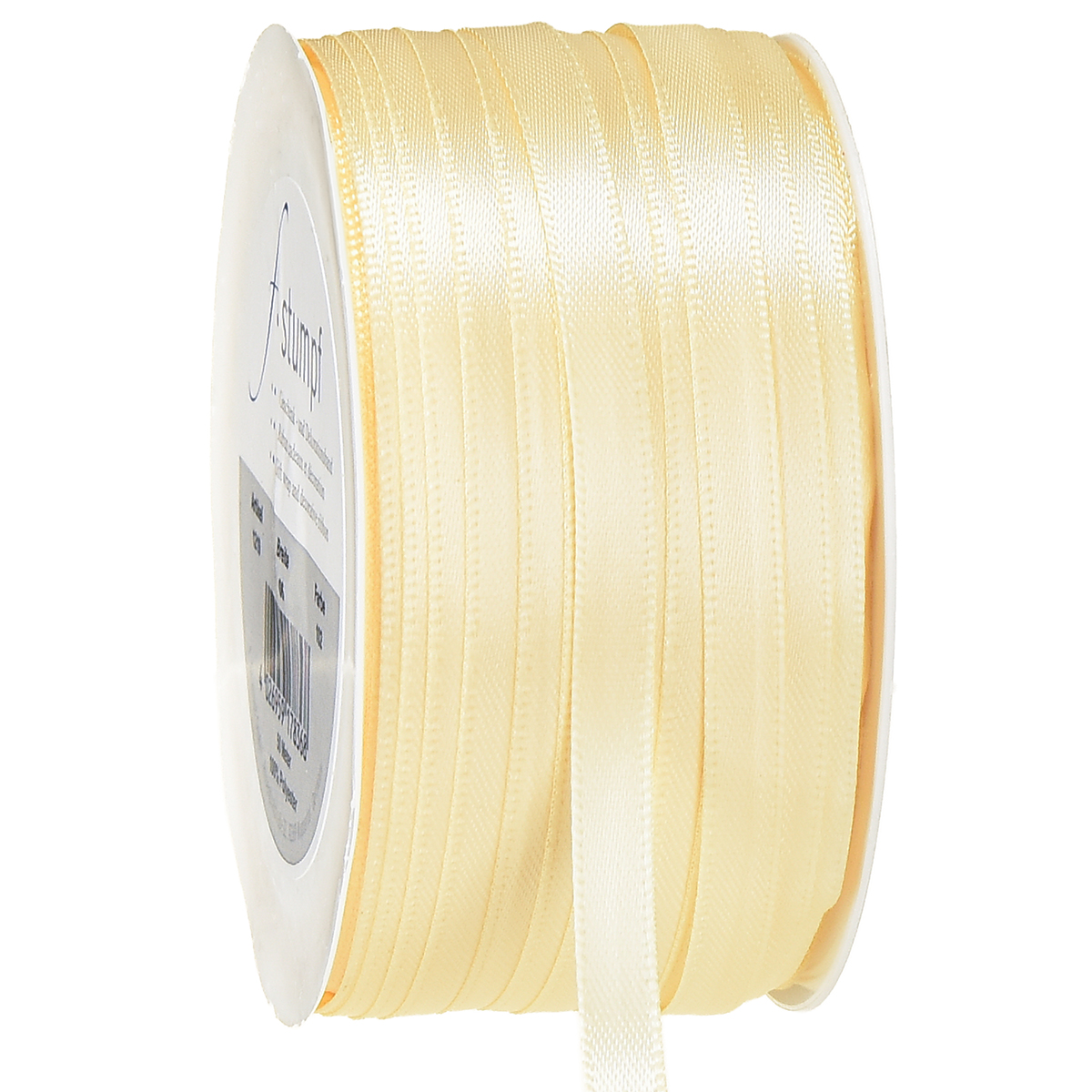 Hecha 100 % de poliéster, esta cinta de regalo color crema mide aproximadamente 6 milímetros de ancho y 50 metros de largo. Viene en un práctico y pequeño carrete de plástico. Se puede guardar fácilmente en un cajón o en una cesta de manualidades.