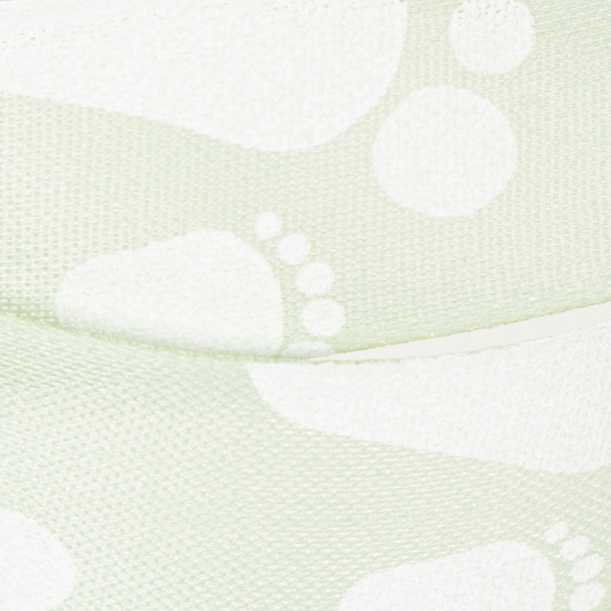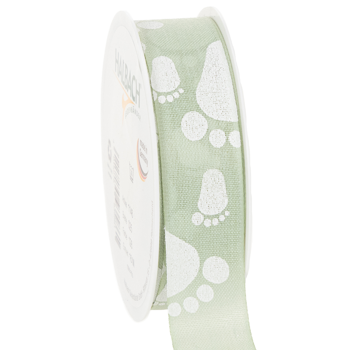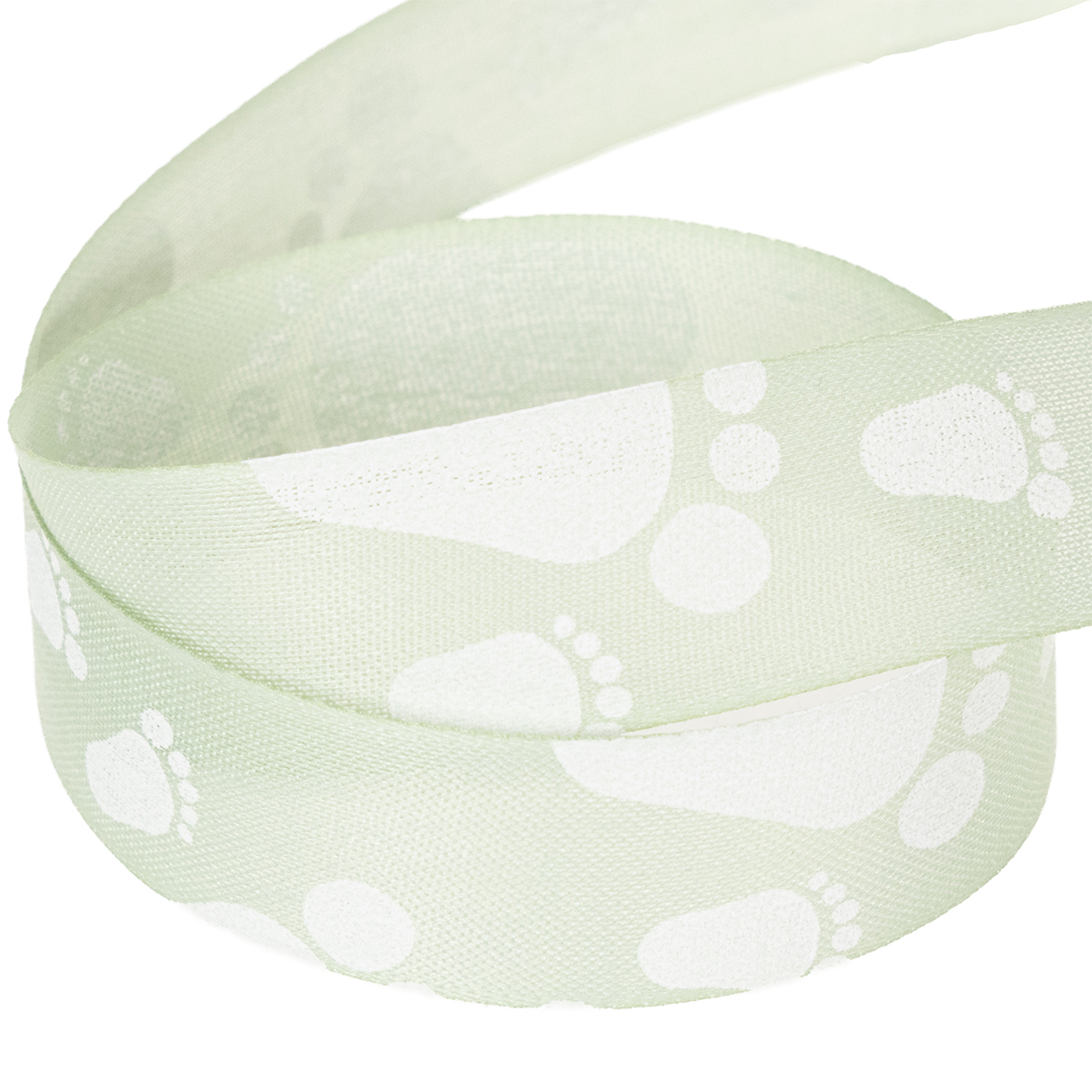 El fondo verde pastel claro de la cinta de tela está decorado con huellas de pies más pequeñas y más grandes. En blanco, los pies del bebé crean un bonito contraste con el color de la cinta decorativa y captan hábilmente el tema del feliz acontecimiento.