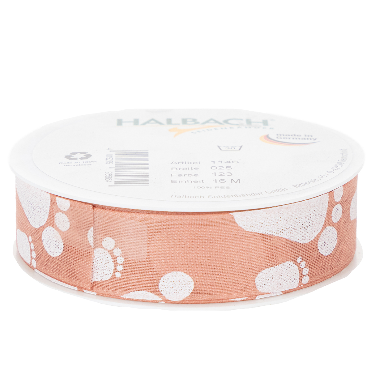 La cinta de regalo con los pies del bebé es una cinta de plástico de alta calidad fabricada en Alemania. La cinta de seda se puede lavar a máquina hasta 30°C. Los bordes ribeteados evitan que la banda se deshilache.