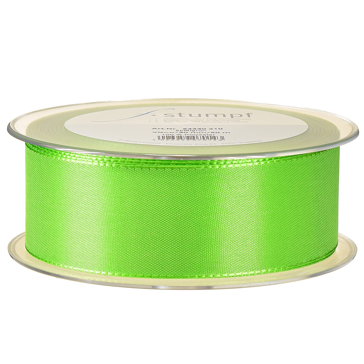 La cinta de regalo o decoración de color verde claro mide aproximadamente 40 milímetros de ancho y unos 50 metros de largo. Estaba hecho de 100% poliéster.