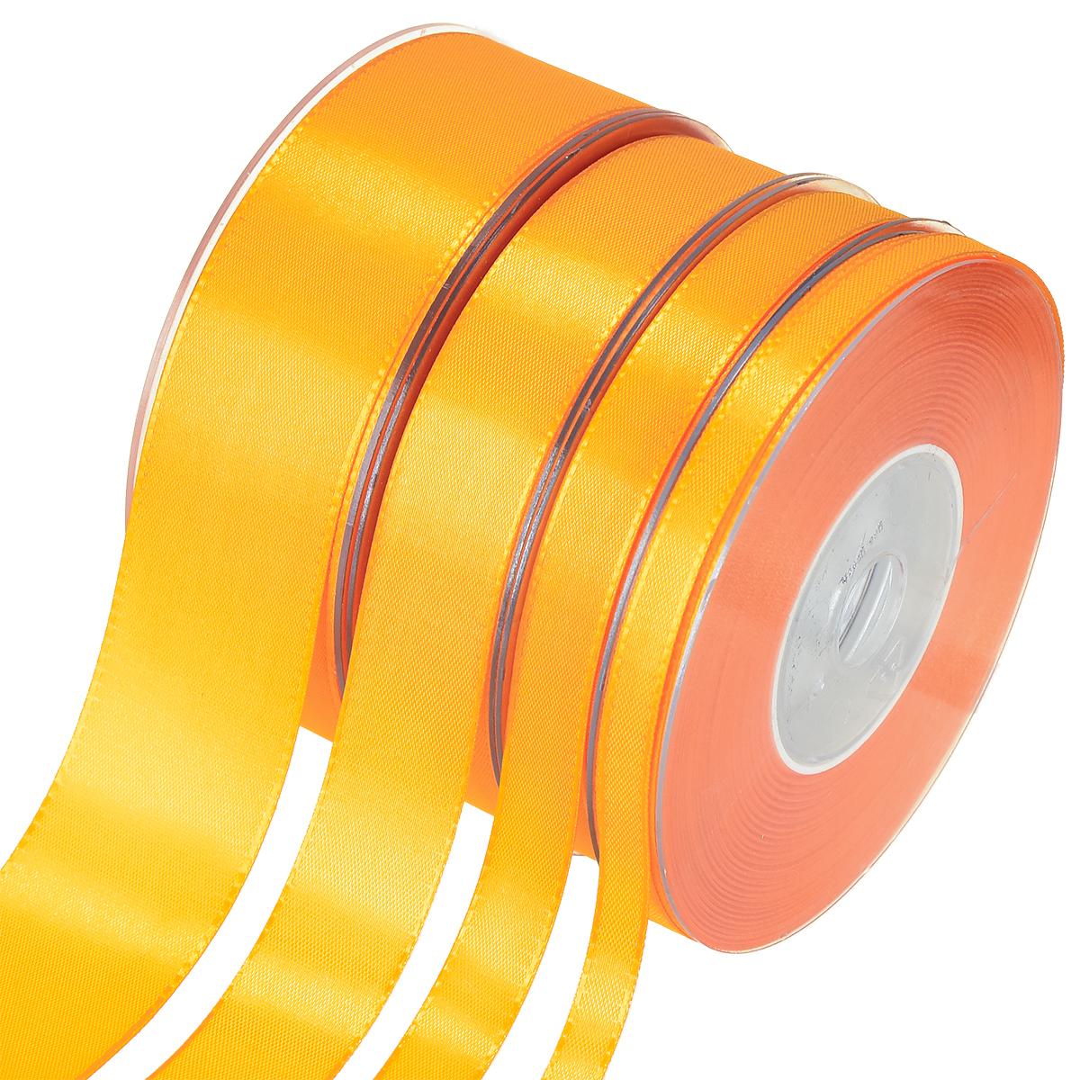 La cinta de regalo y decoración en naranja está envuelta en un carrete de plástico. Cada variante tiene una longitud de aproximadamente 50 metros.