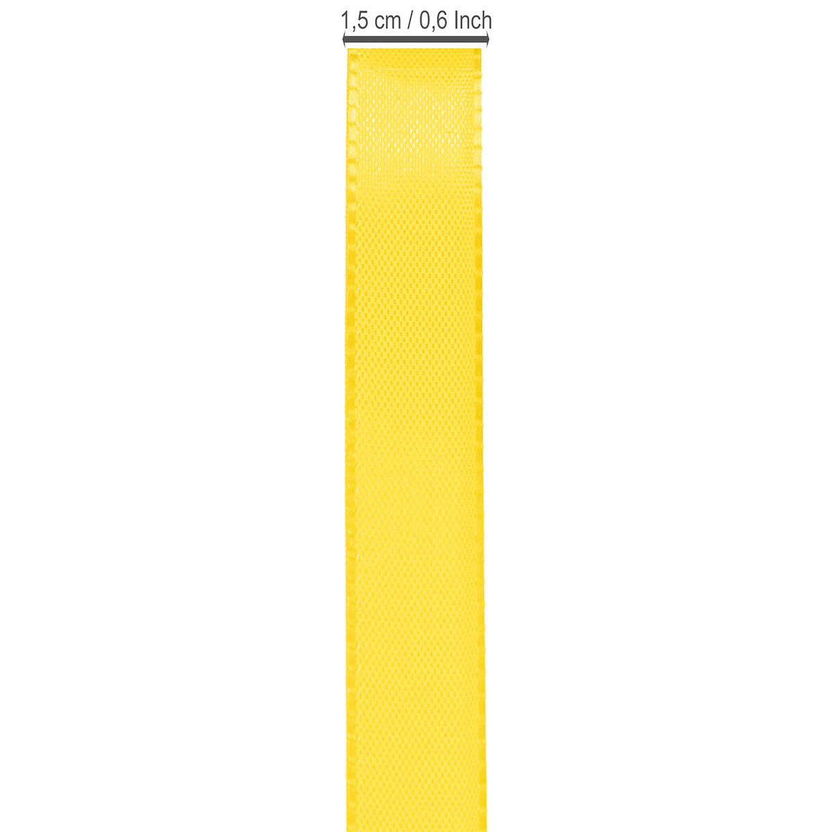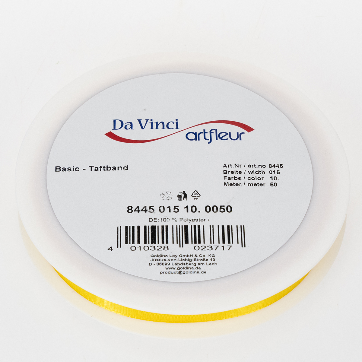 La cinta amarilla para regalos y decoración, hecha 100 % de poliéster, mide aproximadamente 15 milímetros de ancho y aproximadamente 50 metros de largo. Se enrolla en un práctico carrete de plástico.