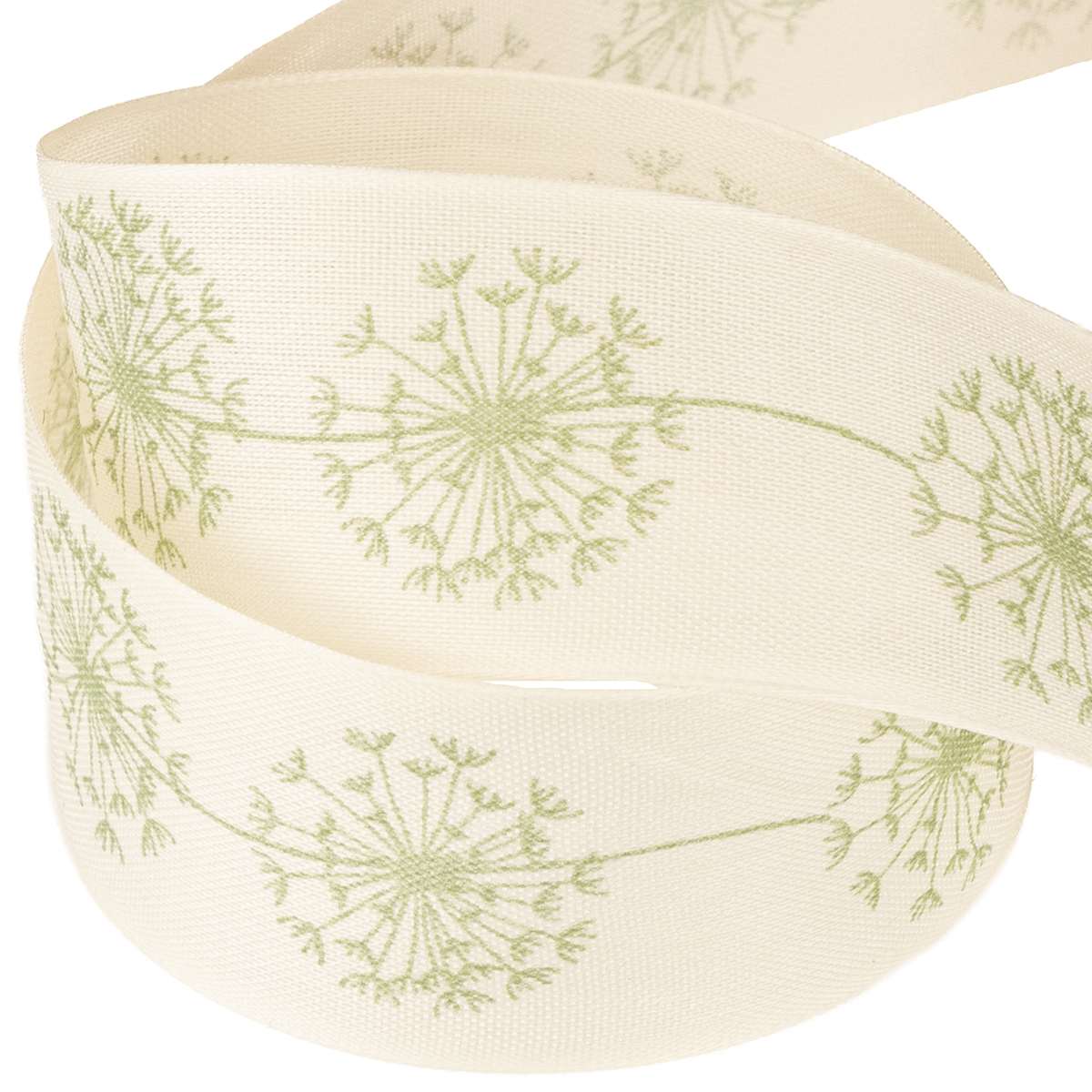 Cinta decorativa ancha con dientes de león en color crema: elegancia primaveral para cualquier decoración.