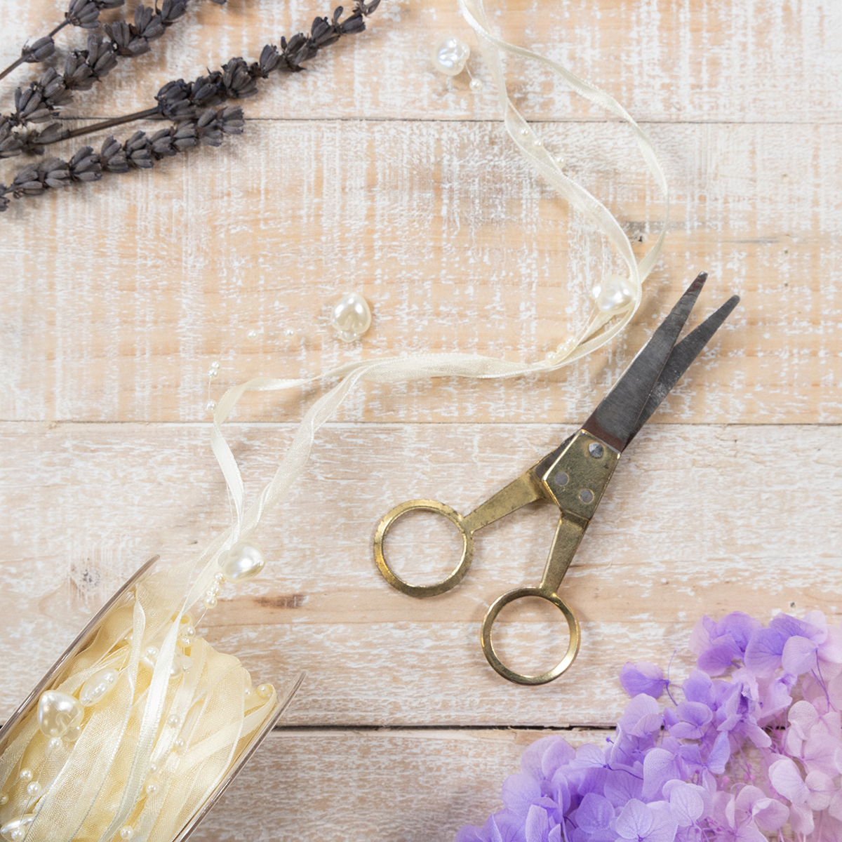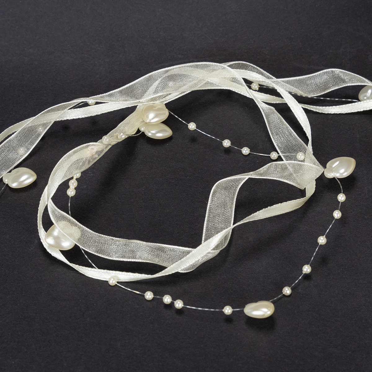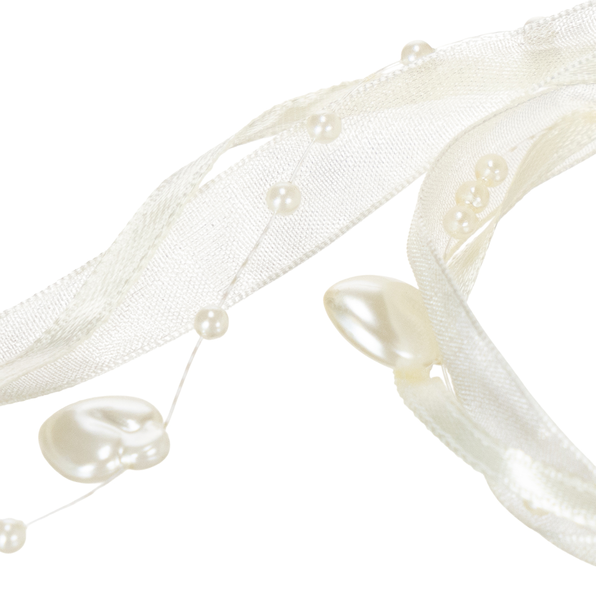 La cinta de seda ha sido diseñada con gran atención al detalle y consiste en una cinta semitransparente con un orillo. El brillo de nácar en la cinta, los corazones y las cuentas emanan un encanto glamuroso.