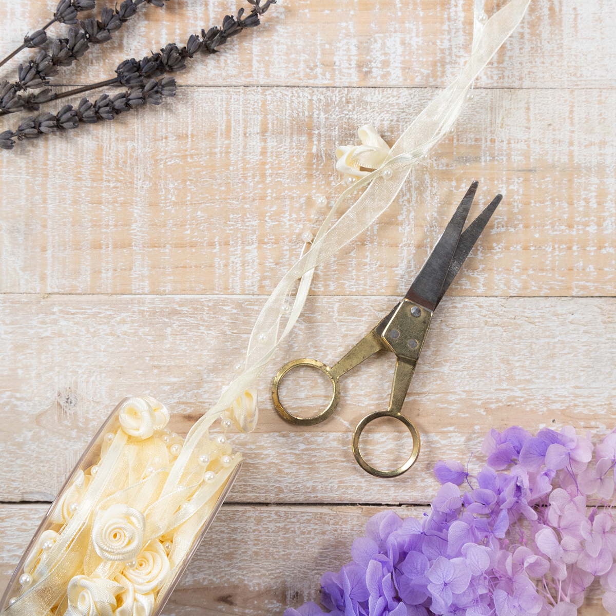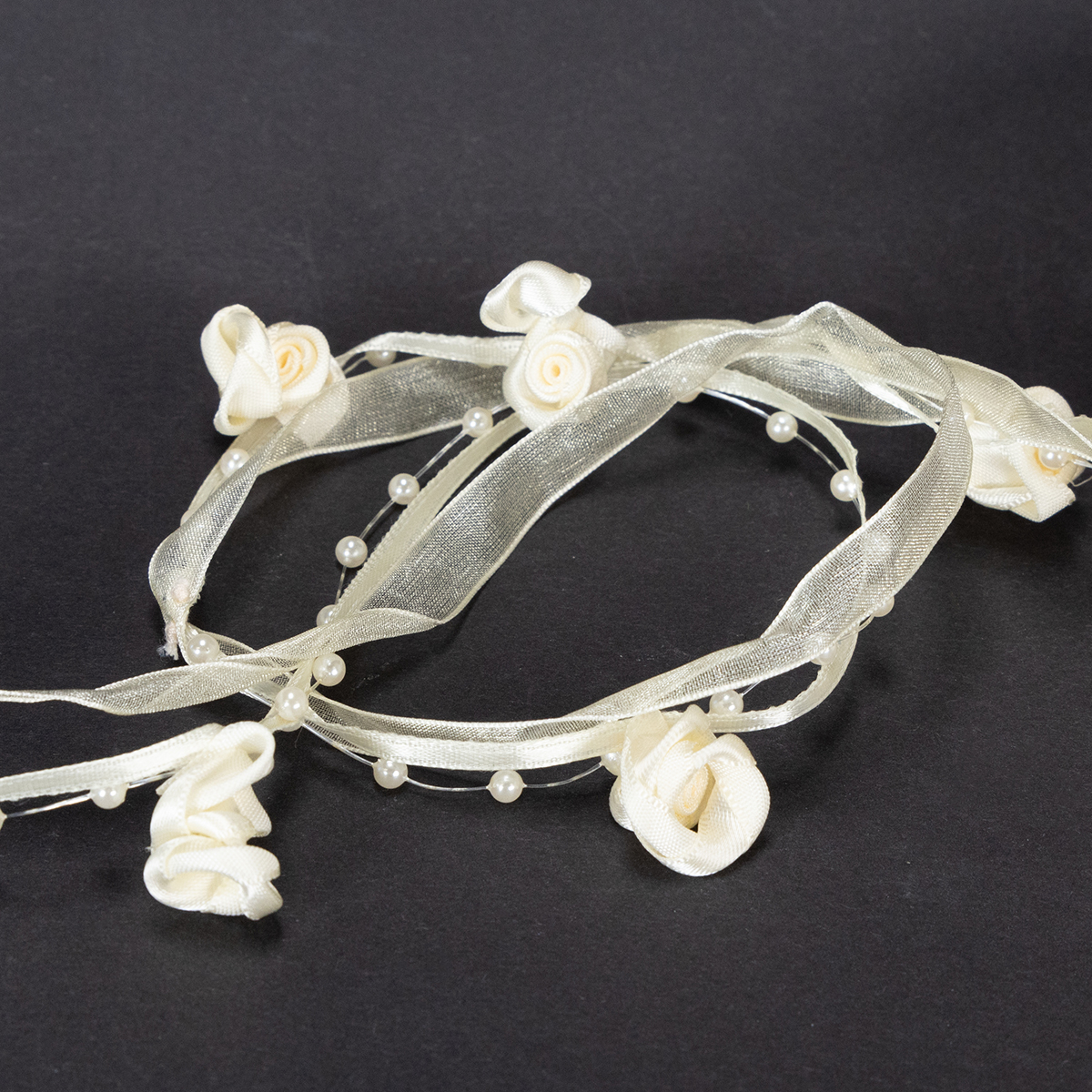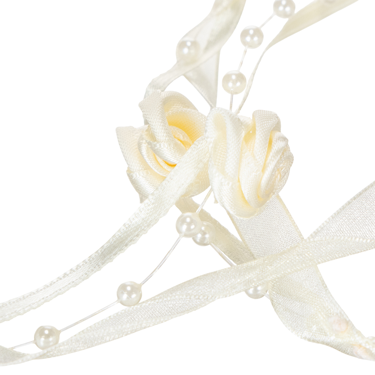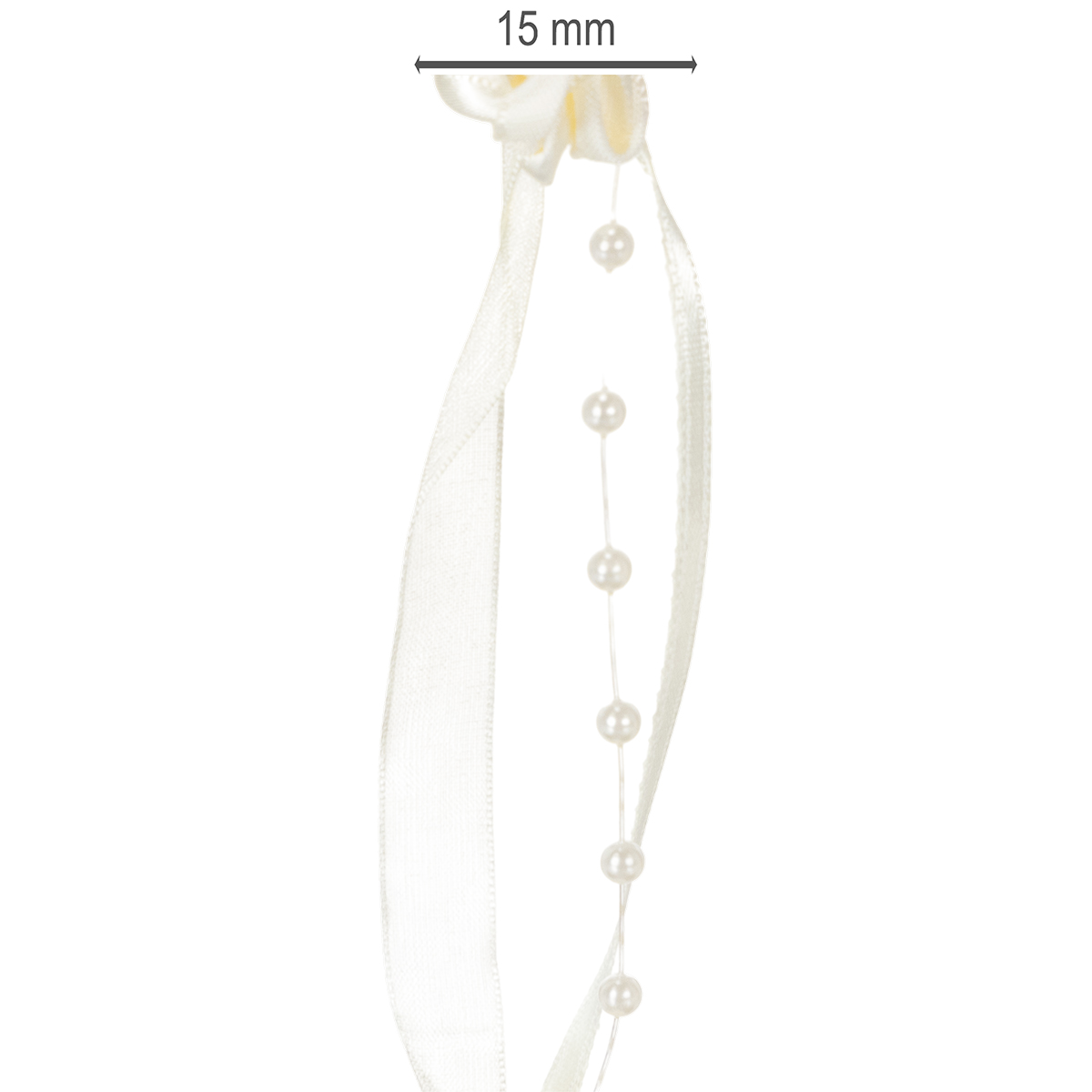 La cinta Valentino en crema tiene aproximadamente 5 metros de largo y aproximadamente 15 milímetros de ancho. Las rosas tienen un diámetro de aproximadamente 2 centímetros, mientras que las cabezas de perlas tienen un diámetro de aproximadamente 0,4 milímetros.