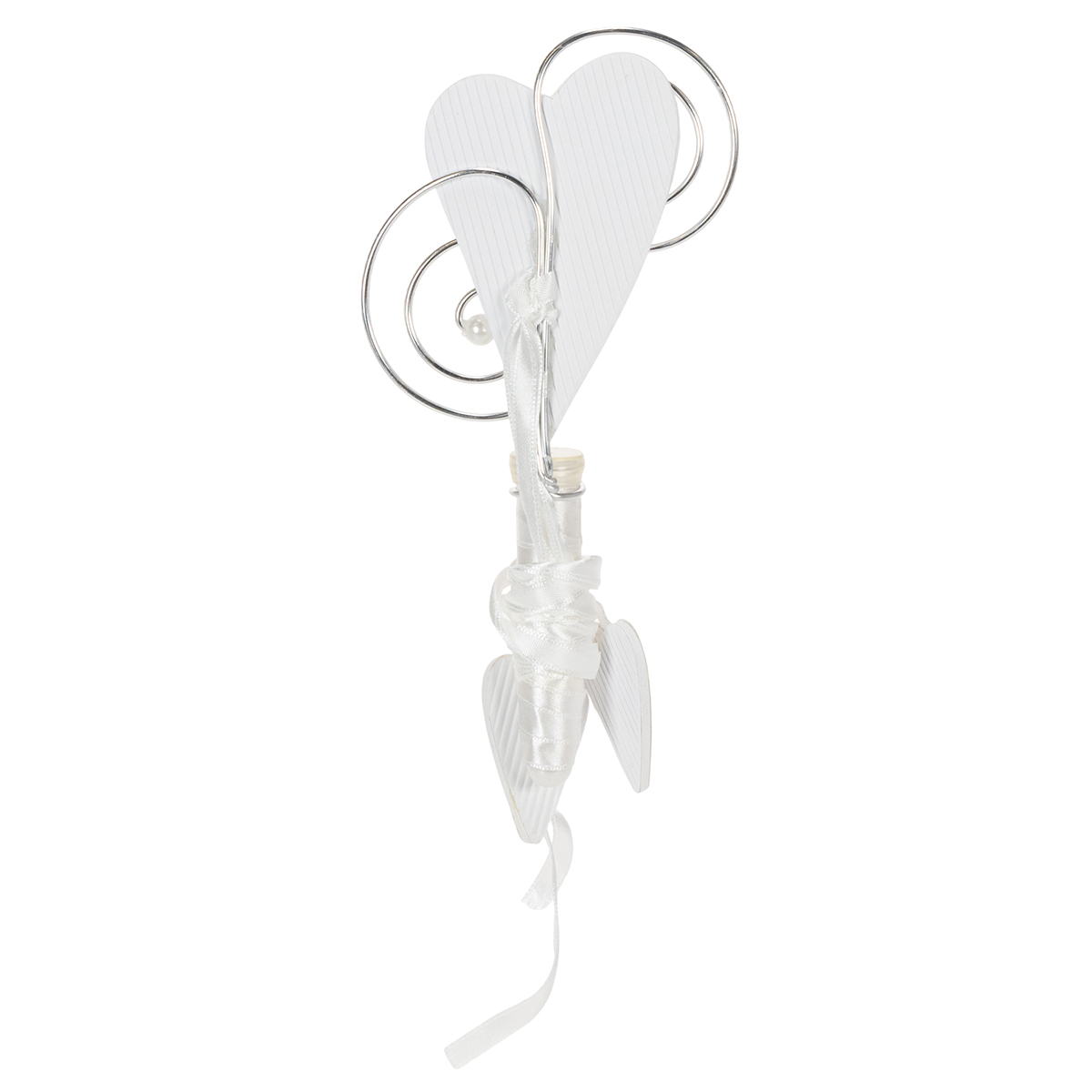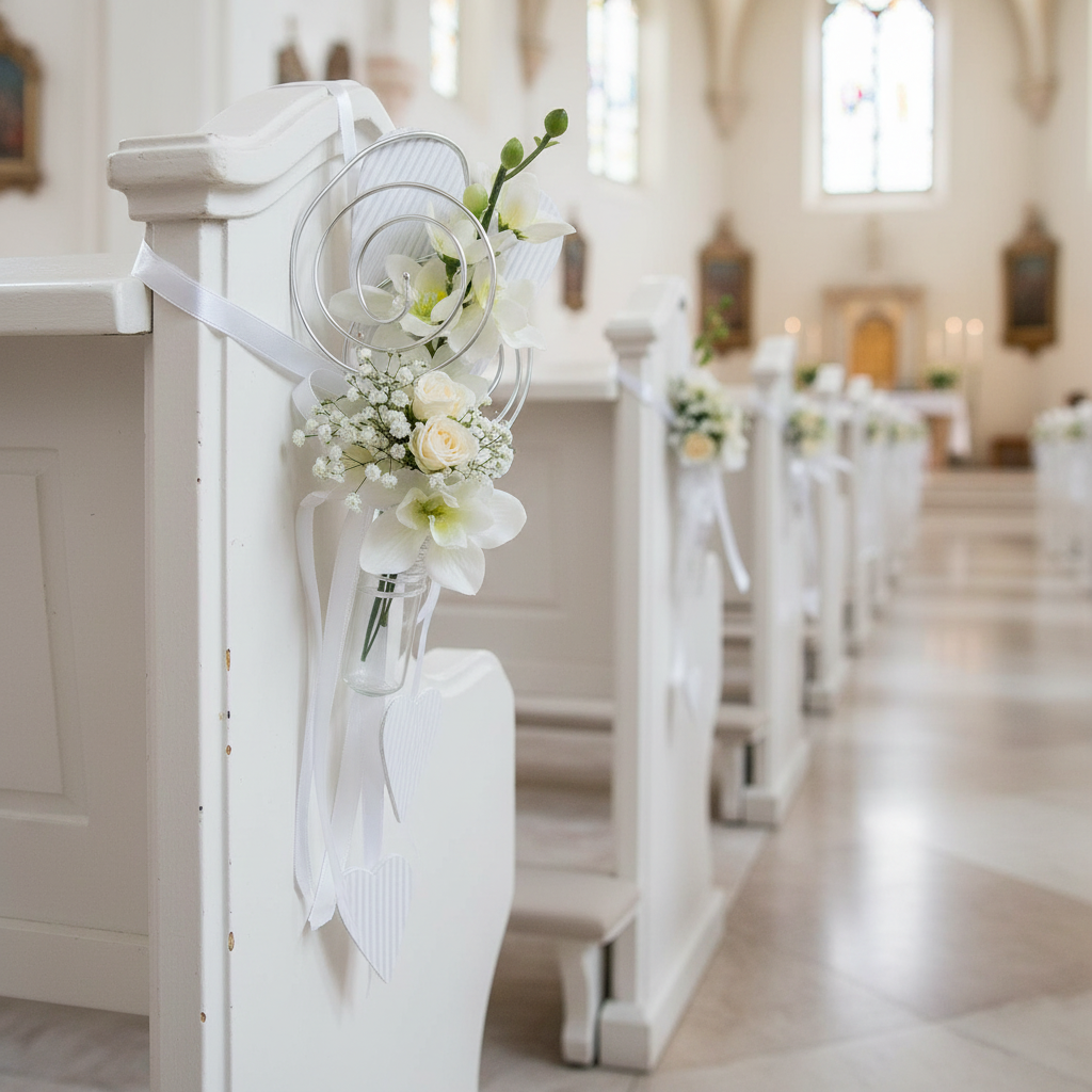 ¡Esta percha de banco con tubo y corazón no debe faltar en ninguna decoración de bodas! Cuelgue el corazón con un gancho en el exterior de los bancos y deje que la cinta blanca de seda, a la que también se unen dos corazones con papel corrugado, caiga muy bien al suelo. Como si eso no fuera suficiente, el remolque tiene un dispositivo de sujeción redondo, en el cual se ajusta como el guante, el tubo de suministro adjunto se ajusta.