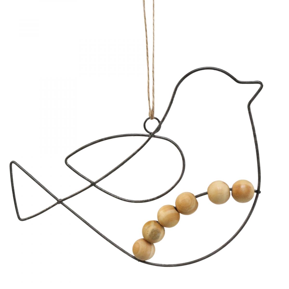 Estas seis etiquetas decorativas son perfectas para la primavera. Seis cuentas de madera están alineadas en la dulce decoración de pájaros de metal.Las alas del pájaro están unidas y se muestra una barriga redonda en la parte inferior de la decoración del pájaro. En la parte trasera, la decoración de metal se enrolla como un arco en una cola. En el extremo frontal, el alambre de metal negro de la decoración colgante se estrecha en un pico puntiagudo pero ligeramente redondeado. ¿Quizás el pájaro decorativo es un carbonero o un petirrojo?