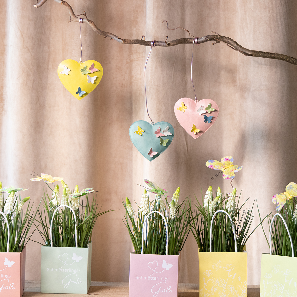 Estos adornos colgantes de corazón son más que simples adornos. Son una invitación a darle vida y un toque acogedor a tu hogar. Con 10,5 cm de altura y detalles elaborados con cariño, son ideales para añadir un toque primaveral. Los tres colores (amarillo, rosa y azul) combinan a la perfección y crean un ambiente alegre. El metal garantiza su estabilidad, mientras que las mariposas en relieve les dan un toque tridimensional y divertido.