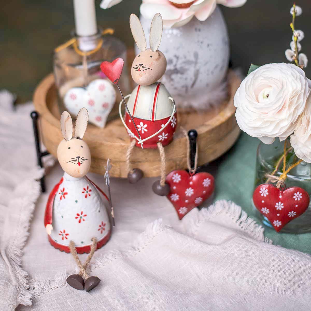 Dado que los conejos son principalmente de color rojo y crema, las figuras decorativas son ideales para el estilo de casa de campo. Coloca la decoración del conejito de forma casual sobre muebles antiguos de madera o sobre una corona natural. El conejo decorativo convierte inmediatamente su decoración de primavera en un punto de atracción. Por eso, los conejitos de metal también son ideales como decoración de escaparates para Pascua.