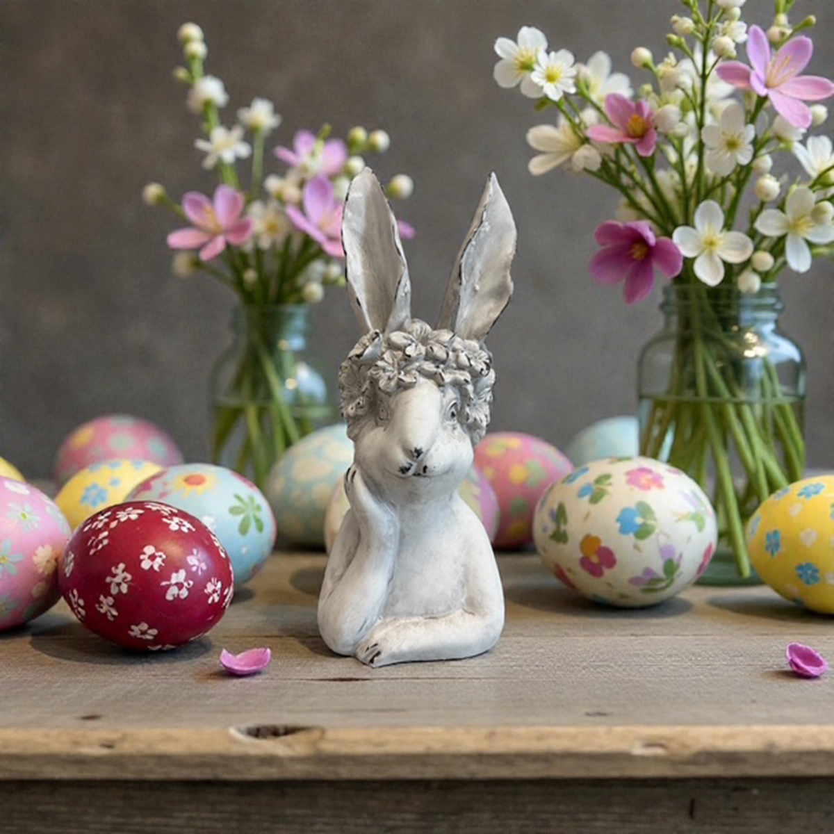 Nuestro conejo decorativo impresiona por su armoniosa combinación de elegancia discreta y delicados detalles. Su expresiva pose con la mano que lo sostiene y la alegre corona floral en la cabeza le otorgan una personalidad única. Su atractivo color gris lo hace versátil, mientras que su material cerámico de alta calidad garantiza estabilidad y durabilidad. Es apto tanto para interiores como para exteriores cubiertos.