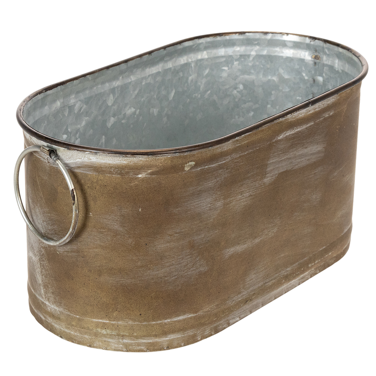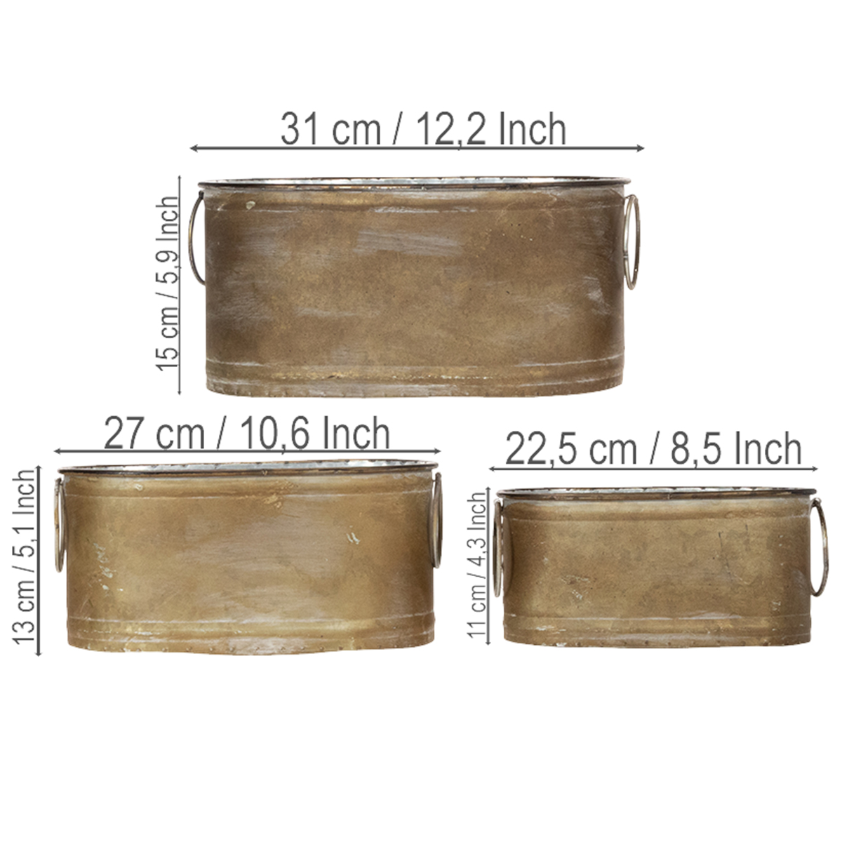 Los maceteros del juego de 3 tienen forma de pequeñas tinas. El exterior de las tinas de metal está lavado de color blanco cobre. El color y la forma son de estilo retro, lo que los hace adecuados para una mesa vintage. El carácter retro queda subrayado por los grandes anillos móviles que actúan como tiradores.