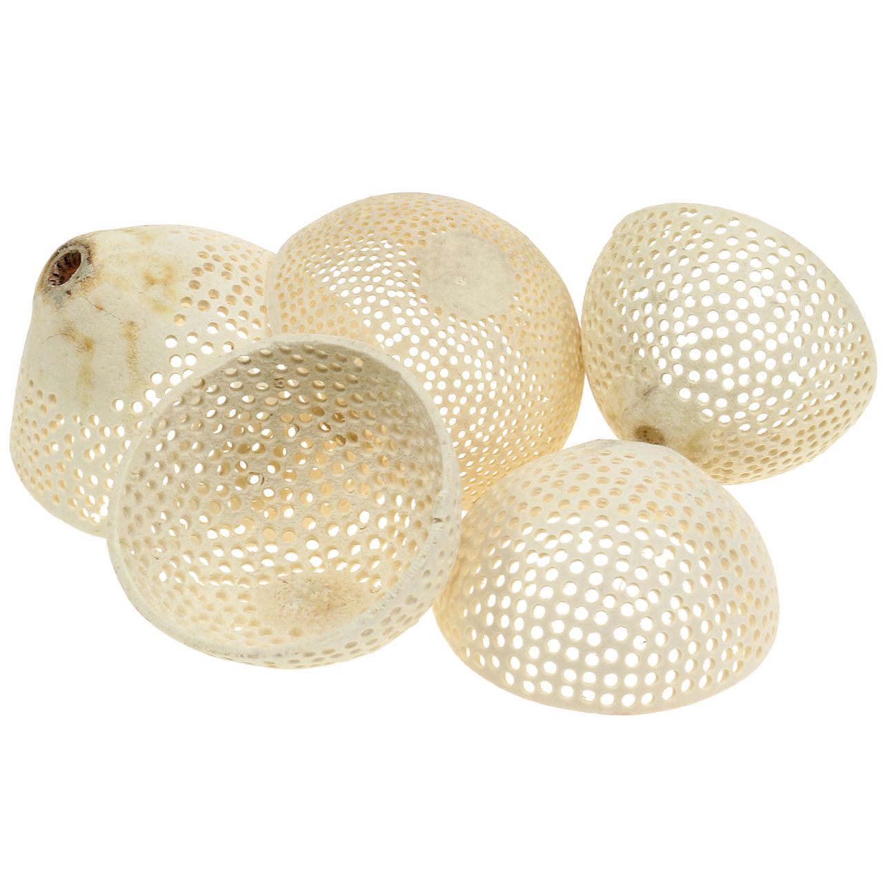 Los frutos secos blanqueados tipo Bell Cup están disponibles en un juego de 10 piezas. Cada ejemplar está realizado íntegramente en madera. El diámetro varía entre aproximadamente 8,5 y 11 centímetros.