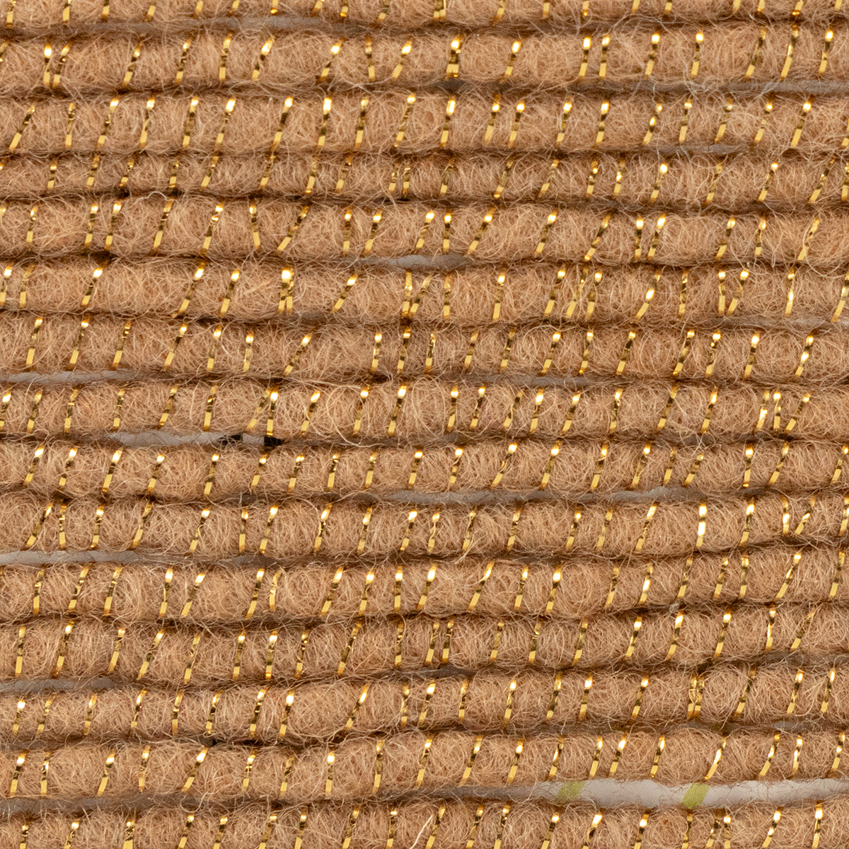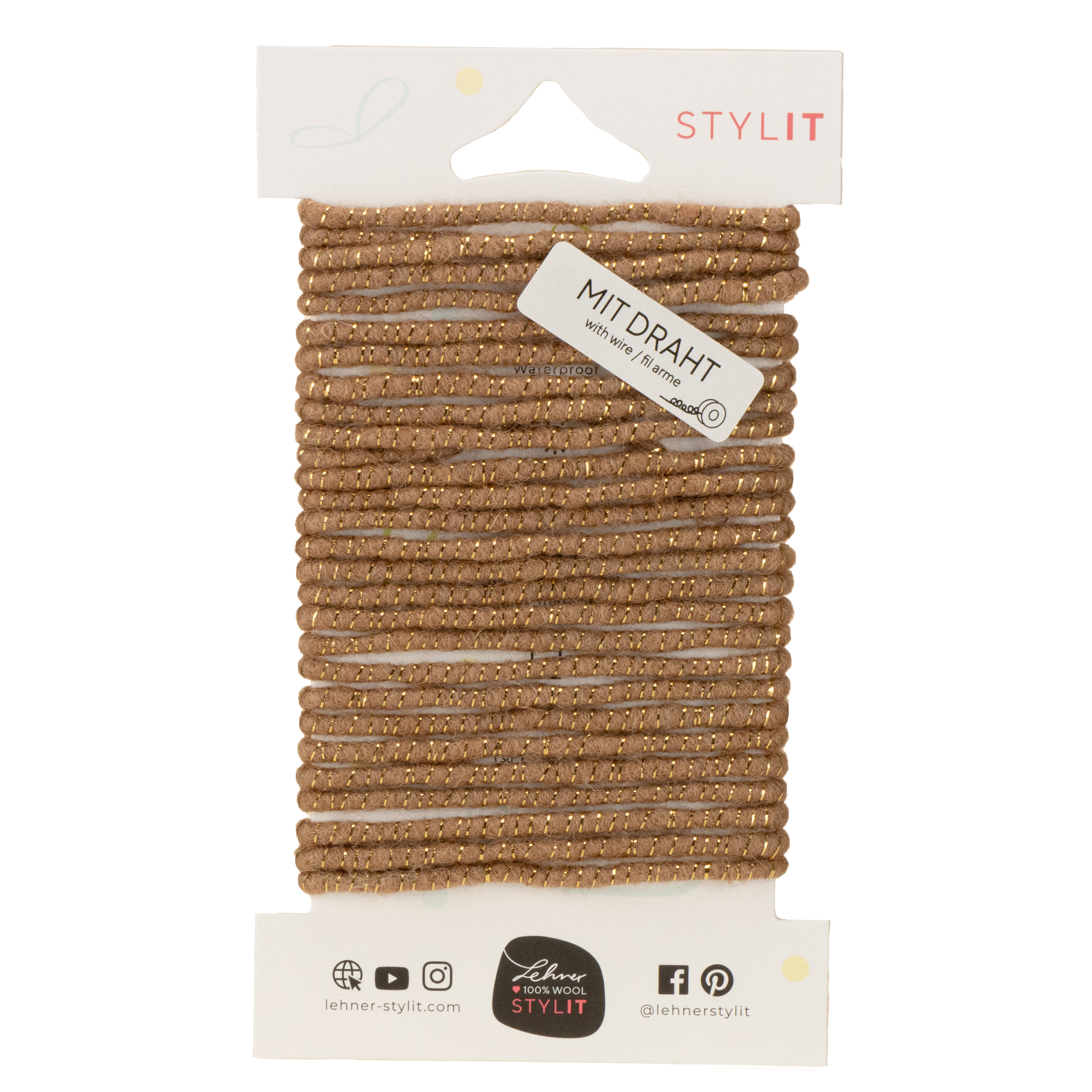 Este cordón de lana marrón y dorado es un auténtico todoterreno para decoración, manualidades y proyectos creativos. Hecho 100 % de lana y entretejido con finos y brillantes detalles de lúrex dorado, tiene un aspecto especialmente sofisticado. Perfecto para añadir un toque cálido y elegante a cualquier proyecto. El alambre integrado en el interior mantiene la forma del cordón y facilita su doblado en todo tipo de formas, desde delicados envoltorios hasta lazos y bucles más atrevidos.