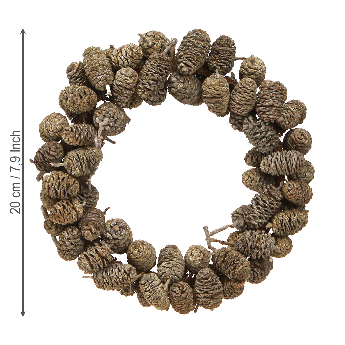 La corona tiene un diámetro aproximado de 18 cm y cuenta con un colgador de yute, lo que le confiere un encanto rústico. Su estilo se encuentra entre la simplicidad escandinava y el aire rústico de una casa de campo, perfecto para los amantes de la decoración natural. Las piñas de aliso se han fijado cuidadosamente a una robusta estructura de alambre y se han lavado en un blanco suave, lo que les da un aspecto especial y delicado. ¿El resultado? ¡Una decoración única, discreta pero impactante!