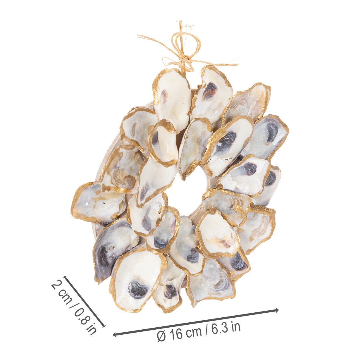 La corona de ostras es más que un simple adorno: ¡es una auténtica pieza decorativa! Con su meticulosa artesanía y materiales de alta calidad, luce un diseño natural y auténtico. Cada concha ha sido cuidadosamente seleccionada y dispuesta en un armonioso círculo de aproximadamente 12 cm de diámetro. Los bordes dorados de las conchas de ostra le dan a la decoración un acabado elegante, perfecto para ocasiones festivas como bodas o cenas de celebración. Pero esta corona también luce espectacular en el día a día. Cuélgala en la cocina, el baño o el dormitorio y disfruta del efecto relajante de su encanto náutico.