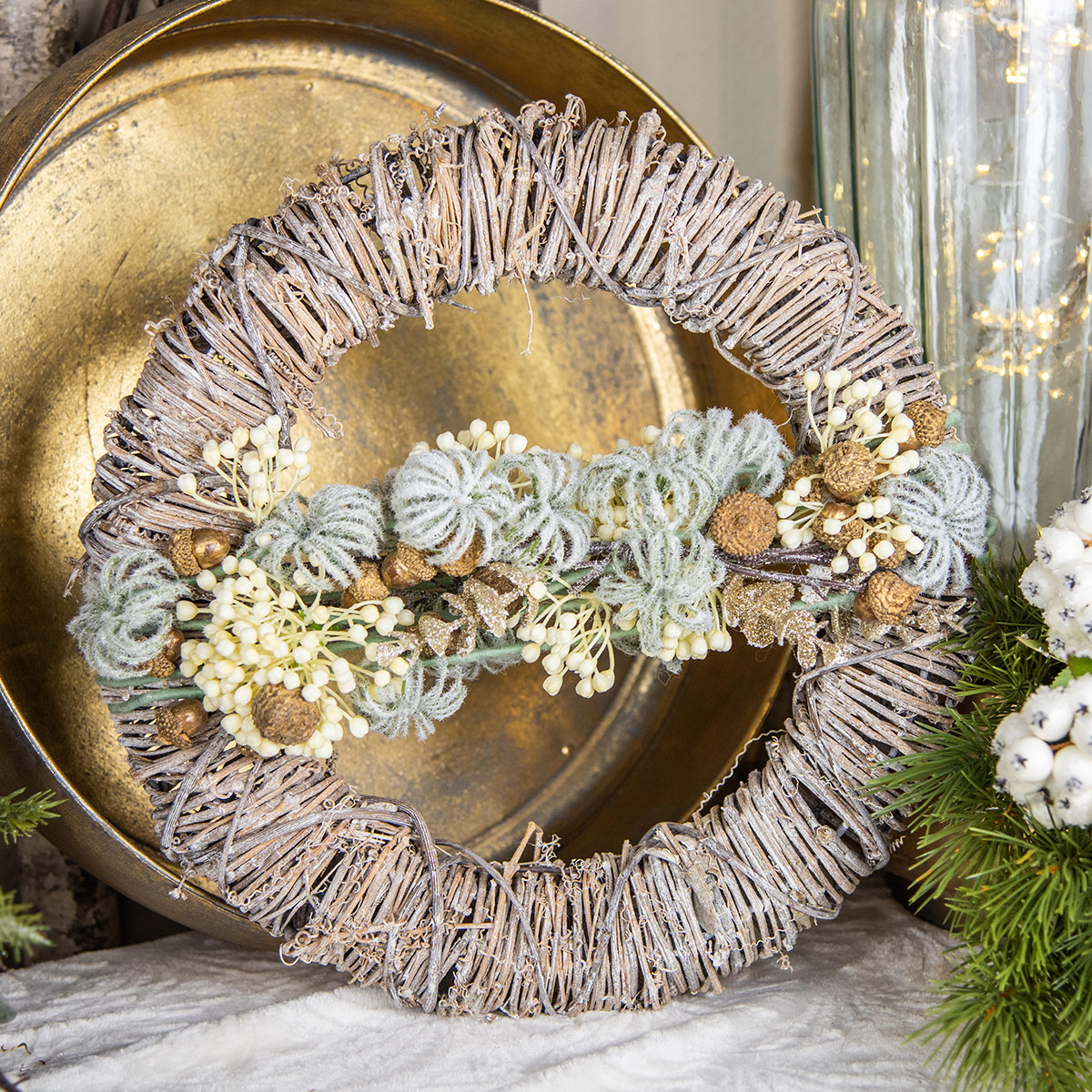 Esta idea de bricolaje es helada y elegante: el eucalipto, que ahora es una parte integral de una corona navideña moderna. Las hortensias con sus hermosas umbelas parecen verdaderas flores artificiales. En la corona de la puerta también hay clemátides artificiales y bellotas reales. La corona de puerta para Adviento es una corona de vid con un diámetro de 38 centímetros.