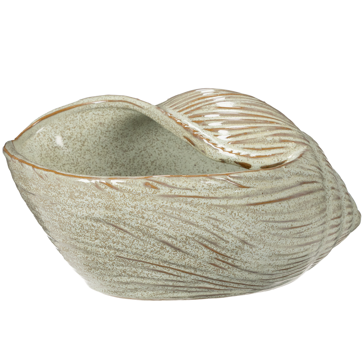 La forma única de este cuenco de cerámica evoca las suaves curvas de una concha marina. La sutil combinación de verdes fluidos y delicados detalles en beige y marrón le confiere una belleza atemporal. Contemplar este diseño evoca recuerdos de largos paseos por la playa: aporta un ambiente tranquilo y natural a cualquier estancia. El cuenco es perfecto para guardar llaves de forma atractiva en la entrada, exhibir pequeñas joyas en un tocador o incluso como macetero para añadir un toque de elegancia con pequeñas suculentas.