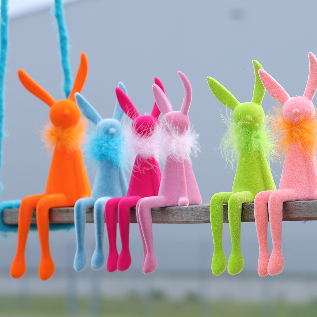 Nuestras decoraciones de conejos de Pascua impresionan por su acertada combinación de estilo y funcionalidad. Su forma especial de estante les permite colocarse perfectamente en el borde de cualquier superficie horizontal, con sus patas colgantes, ocupando un espacio mínimo. Quedan especialmente originales en un aparador del salón, una estantería o incluso en una entrada primaveral. La boa de plumas les da un aspecto elegante y a la vez ligero y alegre que simplemente enternece.