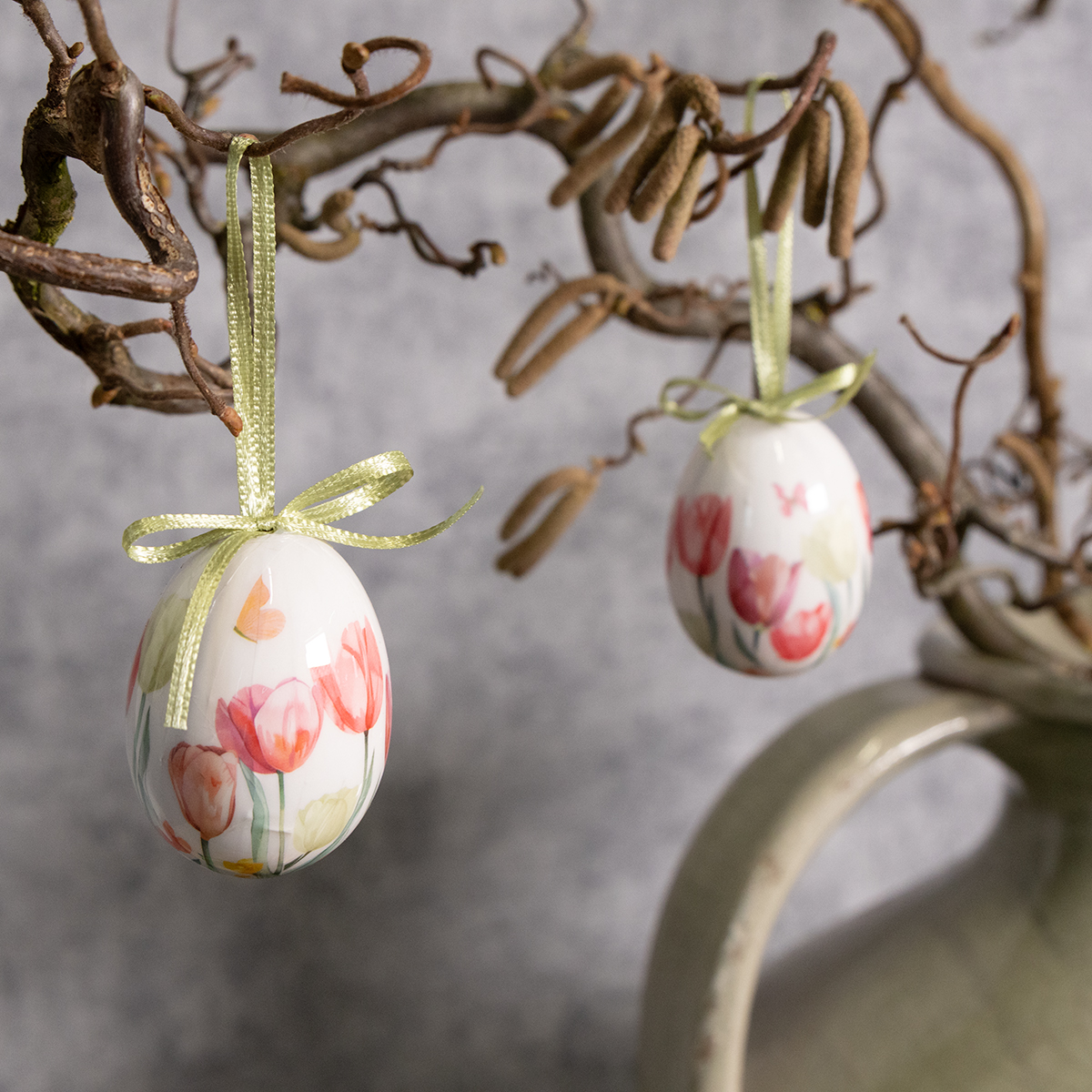 ¡La primavera está a la vuelta de la esquina! ¿Ya has pensado en tus decoraciones de Pascua? ¿Qué te parece algo que no solo sea atemporalmente hermoso, sino que también añada un toque de ligereza a cualquier habitación o árbol de Pascua? Nuestros huevos de Pascua con su encantador motivo de tulipanes son perfectos. La cinta incluida facilita colgarlos en ramas, ventanas o incluso en tu cesta de Pascua. ¿Quieres sorprender a tus invitados con una mesa decorada con estilo? Estos huevos de Pascua decorativos encantarán a cualquier entusiasta de la primavera. El cálido brillo de los delicados tulipanes, combinado con la clásica base blanca, es perfecto para una decoración de estilo rústico, pero también combina a la perfección con interiores modernos y minimalistas. ¡Compruébalo tú mismo y trae la primavera a tu hogar con estas elegantes decoraciones!