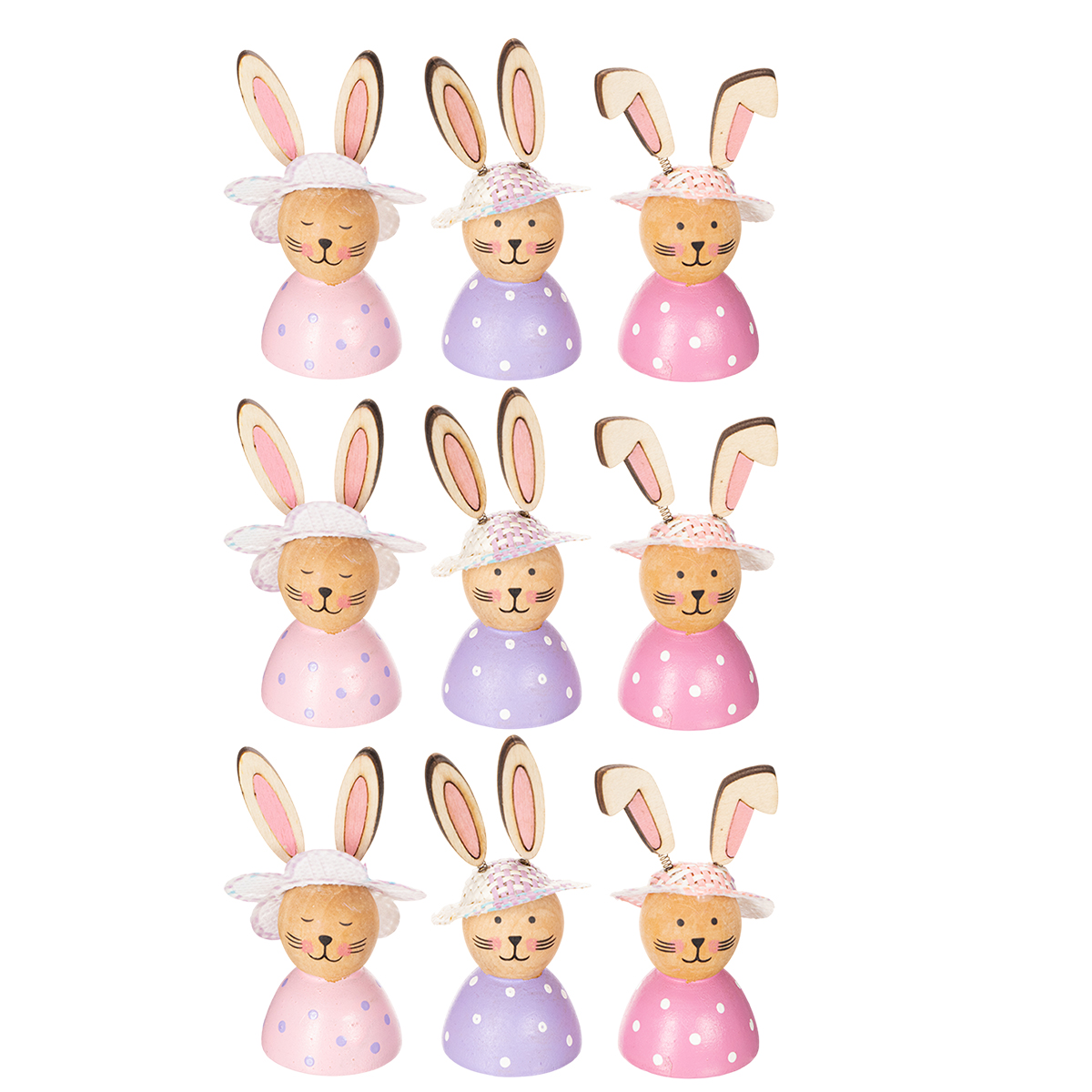 Nombre del producto: Decoración de mesa de conejo de Pascua para primavera, conejitos decorativos con sombreros, 7 cm, 9 piezas
