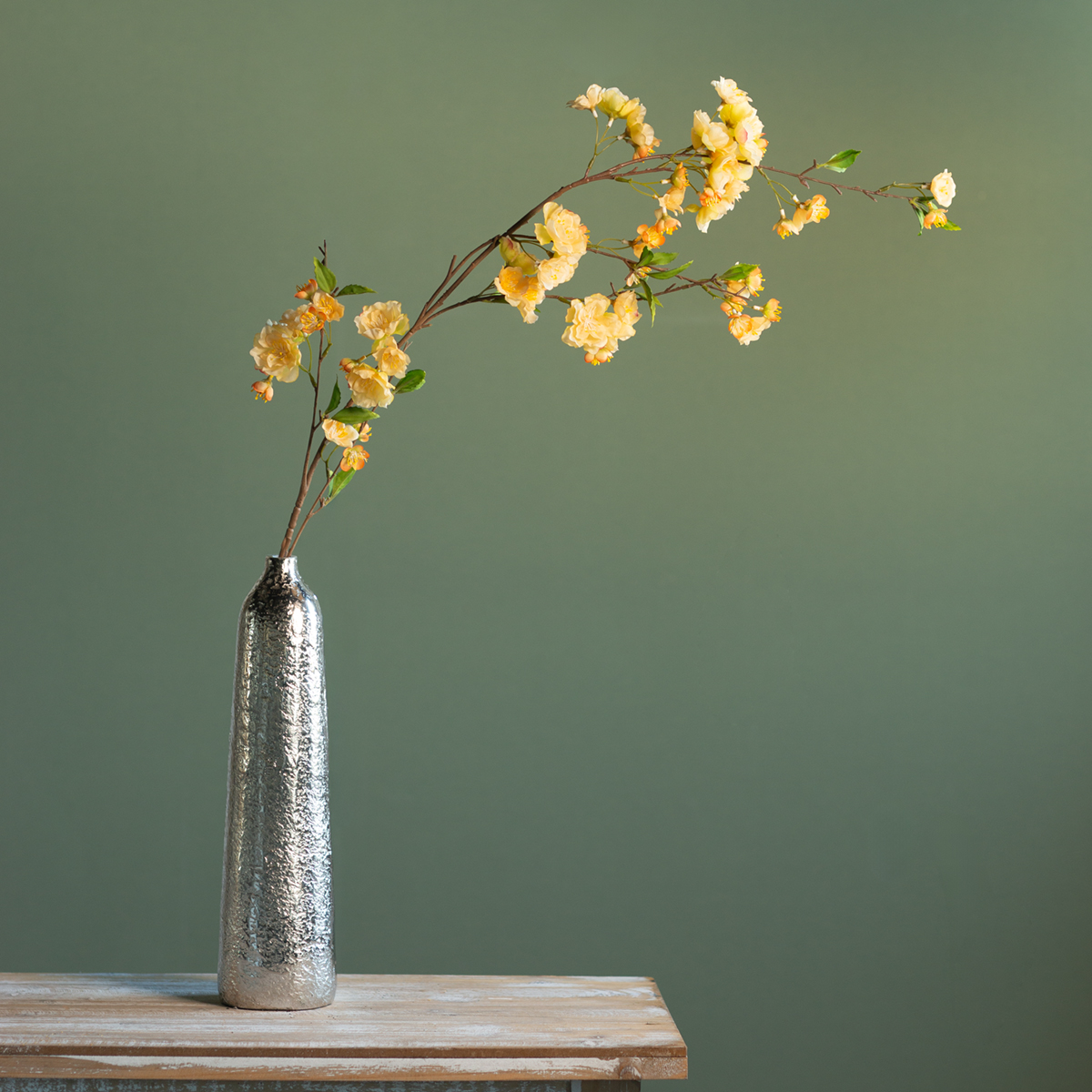 Especialmente al combinarla con materiales naturales como la madera o la cerámica, la rama de cerezo crea una atmósfera armoniosa, ya sea en un estilo rústico o con un moderno diseño Japandi. Incluso una sola rama en un sencillo jarrón de cristal añade un toque vibrante. Para bodas u otros eventos, la rama de cerezo también es una excelente opción: aporta un toque romántico sin sobrecargar la decoración general. Las flores amarillas simbolizan alegría y optimismo, lo que la convierte en una opción maravillosa para ocasiones especiales.