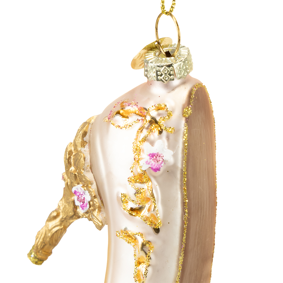 Cada adorno para el árbol de Navidad tiene una historia especial, ¡y estos preciosos zapatos de cristal no son la excepción! Sus finos detalles, como las decoraciones florales doradas artísticamente esculpidas, los hacen verdaderamente especiales. Su anilla para colgarlos facilita su fijación a ramas, guirnaldas o incluso ramitas decorativas en un jarrón. La delicada superficie rosa tiene un agradable acabado satinado que, combinado con el dorado, crea una paleta de colores festiva y armoniosa. Los tacones de plástico aportan estabilidad adicional a los zapatos sin restarles elegancia.