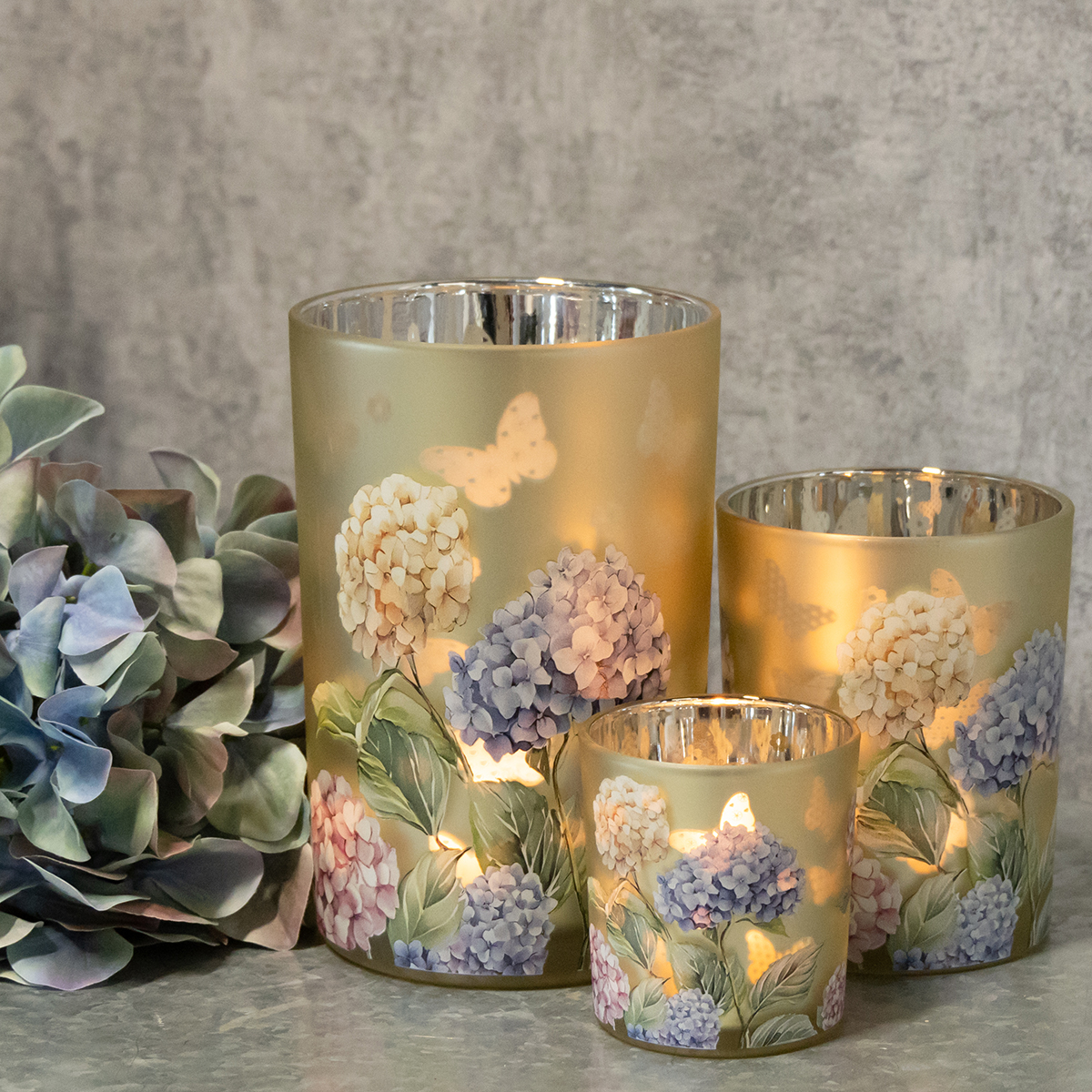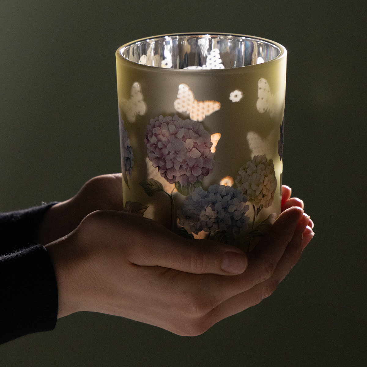 El delicado motivo de hortensias en suaves tonos pastel rosa, azul y beige es especialmente llamativo y realza el elegante estilo del candelabro. Se integra a la perfección con diversos estilos de decoración, ya sea rústico, shabby chic o boho moderno. ¡Ponte cómodo y disfruta de encantadores momentos de luz que crean pequeñas islas de felicidad en tu día a día!