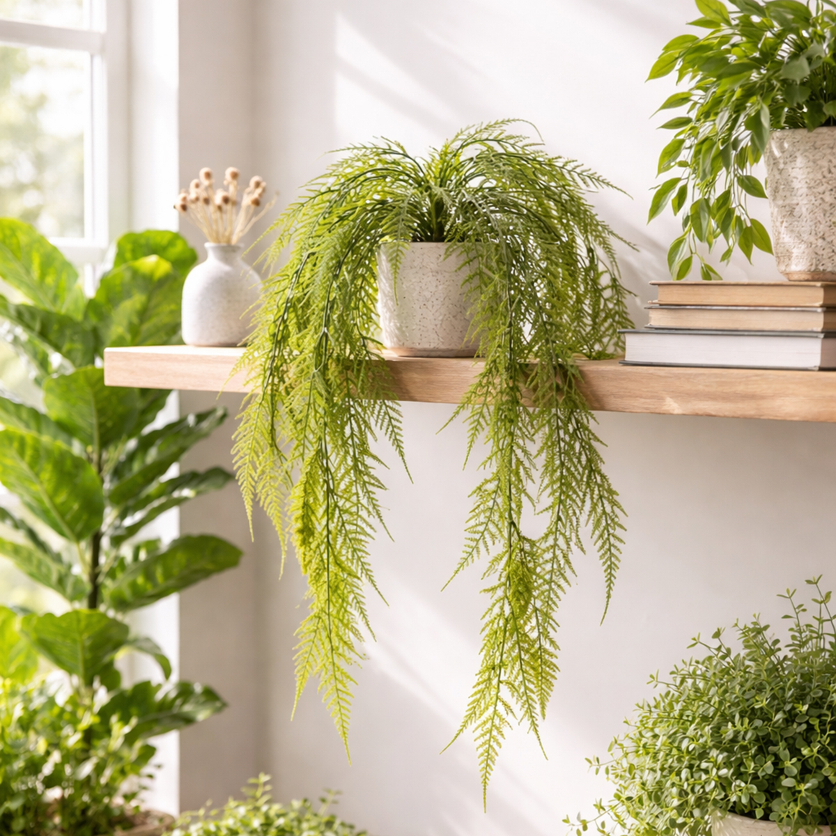 ¿Quién no sueña con un oasis verde y relajante sin tener que preocuparse por el riego, la iluminación ni el mantenimiento? ¡Con este helecho espárrago artificial, puedes traerlo a casa! Esta planta colgante increíblemente realista, con sus elegantes y delicadas ramas, le da vida y estilo a cualquier habitación. Ya sea en la sala, el dormitorio, la oficina o el balcón, es la opción perfecta para quienes desean integrar un toque de naturaleza en su vida diaria sin esfuerzo. Simplemente cuélgala y creará al instante un ambiente acogedor. Sin resequedad ni hojas marchitas, solo una hermosa elegancia de fácil mantenimiento.